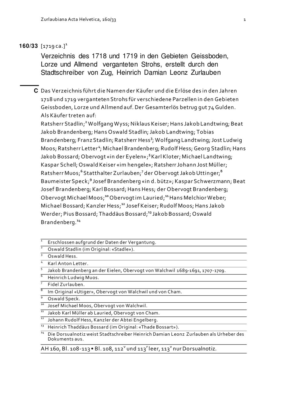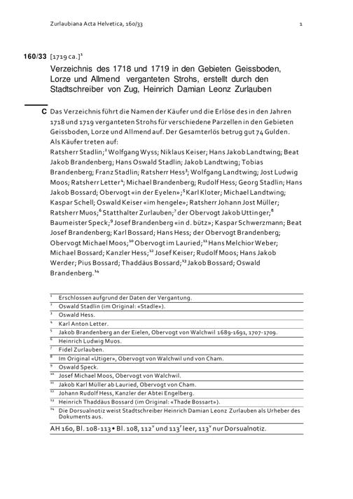 Verzeichnis des 1718 und 1719 in den Gebieten Geissboden, Lorze und Allmend verganteten Strohs, erstellt von Heinrich Damian Leonz Zurlauben, Stadtschreiber Zug