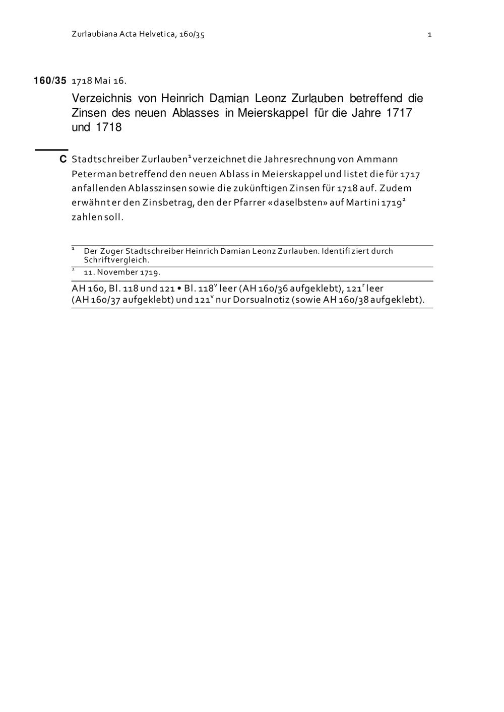 Verzeichnis von Heinrich Damian Leonz Zurlauben betreffend die Zinsen des neuen Ablasses in Meierskappel für die Jahre 1717 und 1718