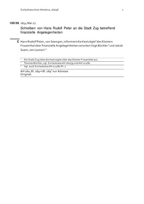 Schreiben von Hans Rudolf Peter an die Stadt Zug betreffend finanzielle Angelege...
