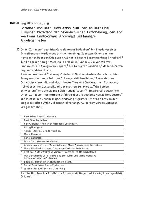 Schreiben von Beat Jakob Anton Zurlauben an Beat Fidel Zurlauben betreffend den österreichischen Erbfolgekrieg, den Tod von Franz Bartholomäus Andermatt und familiäre Angelegenheiten