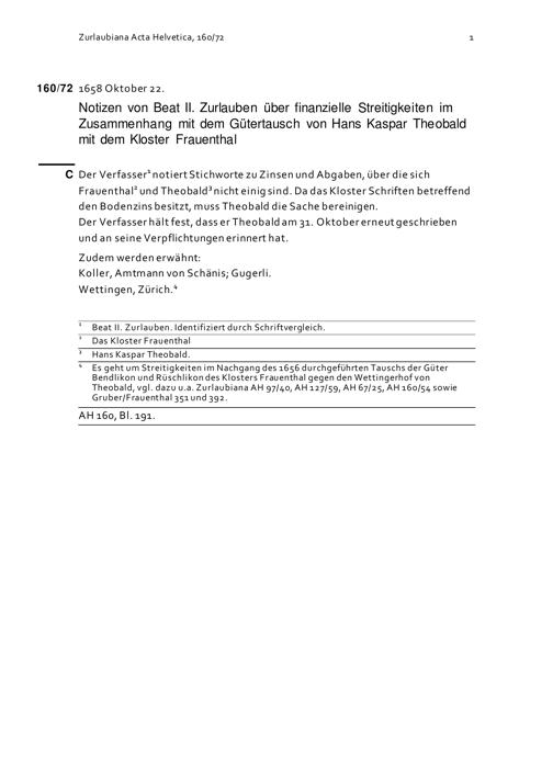 Notiz von Beat II. Zurlauben über finanzielle Streitigkeiten in Zusammenhang mit dem Gütertausch von Hans Kaspar Theobald mit dem Frauenkloster Frauenthal