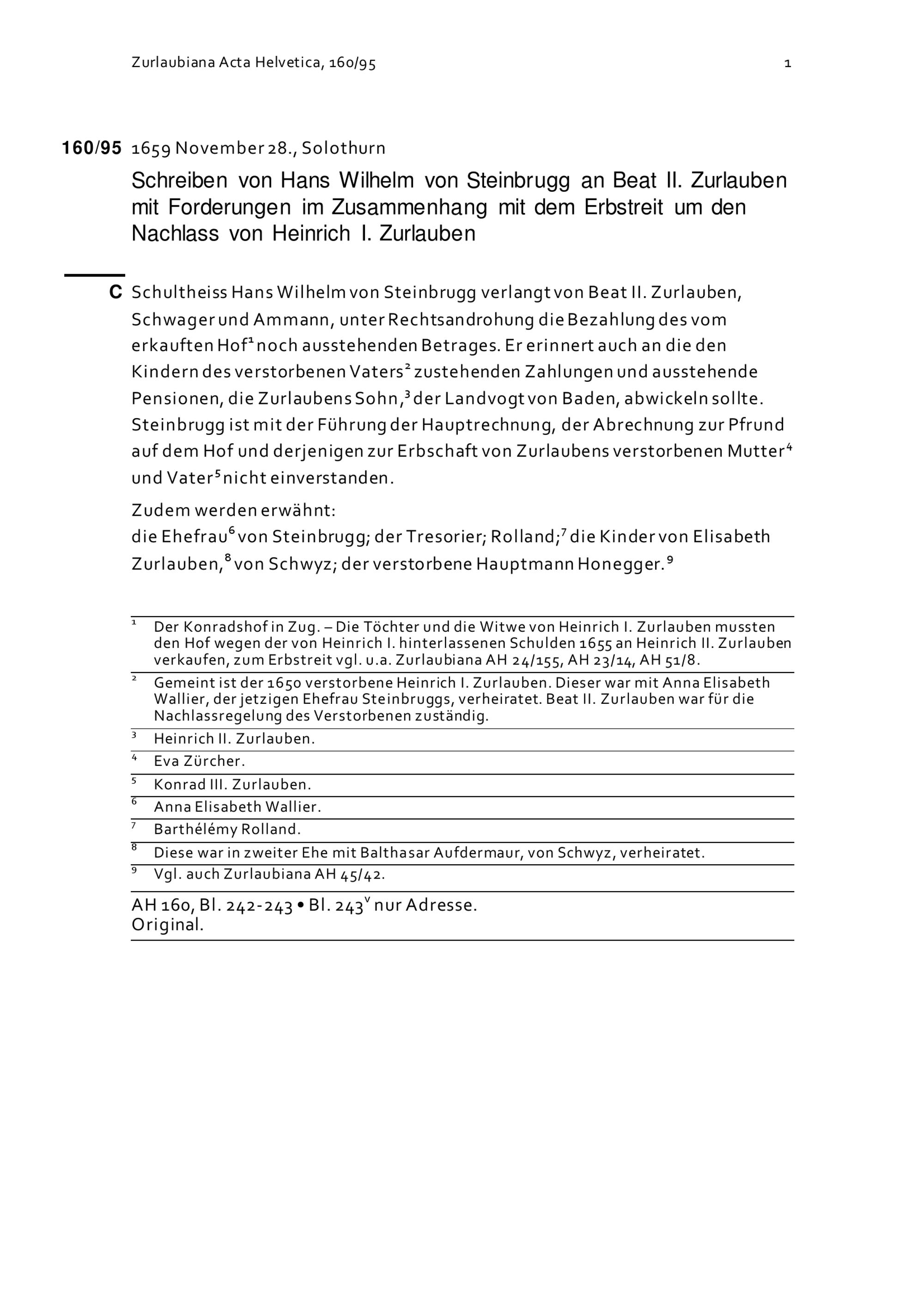 Schreiben von Hans Wilhelm von Steinbrugg an Beat II. Zurlauben mit Forderungen in Zusammenhang mit dem Erbstreit um den Nachlass von Heinrich I. Zurlauben