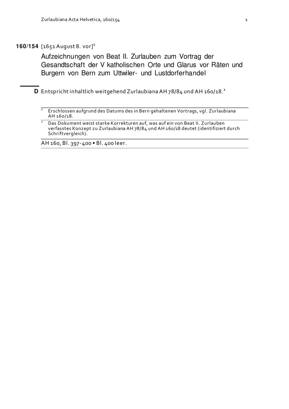 Aufzeichnungen von Beat II. Zurlauben zum Vortrag der Gesandtschaft der Fünf Katholischen Orte und Glarus vor Räten und Burgern von Bern zum Uttwiler- und Lustdorferhandel