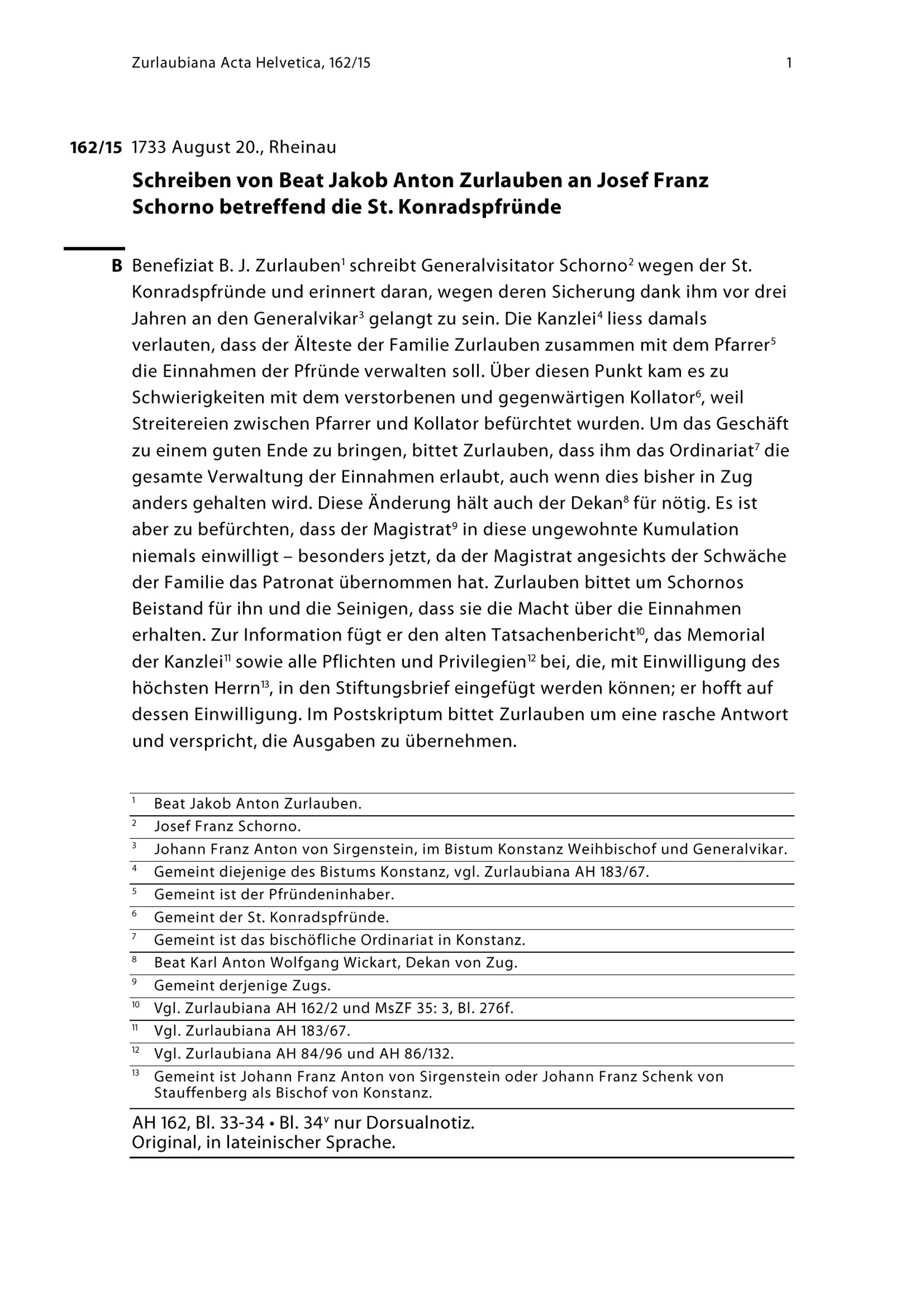 Schreiben von Beat Jakob Anton Zurlauben an Josef Franz Schorno betreffend die Sankt-Konradspfrund