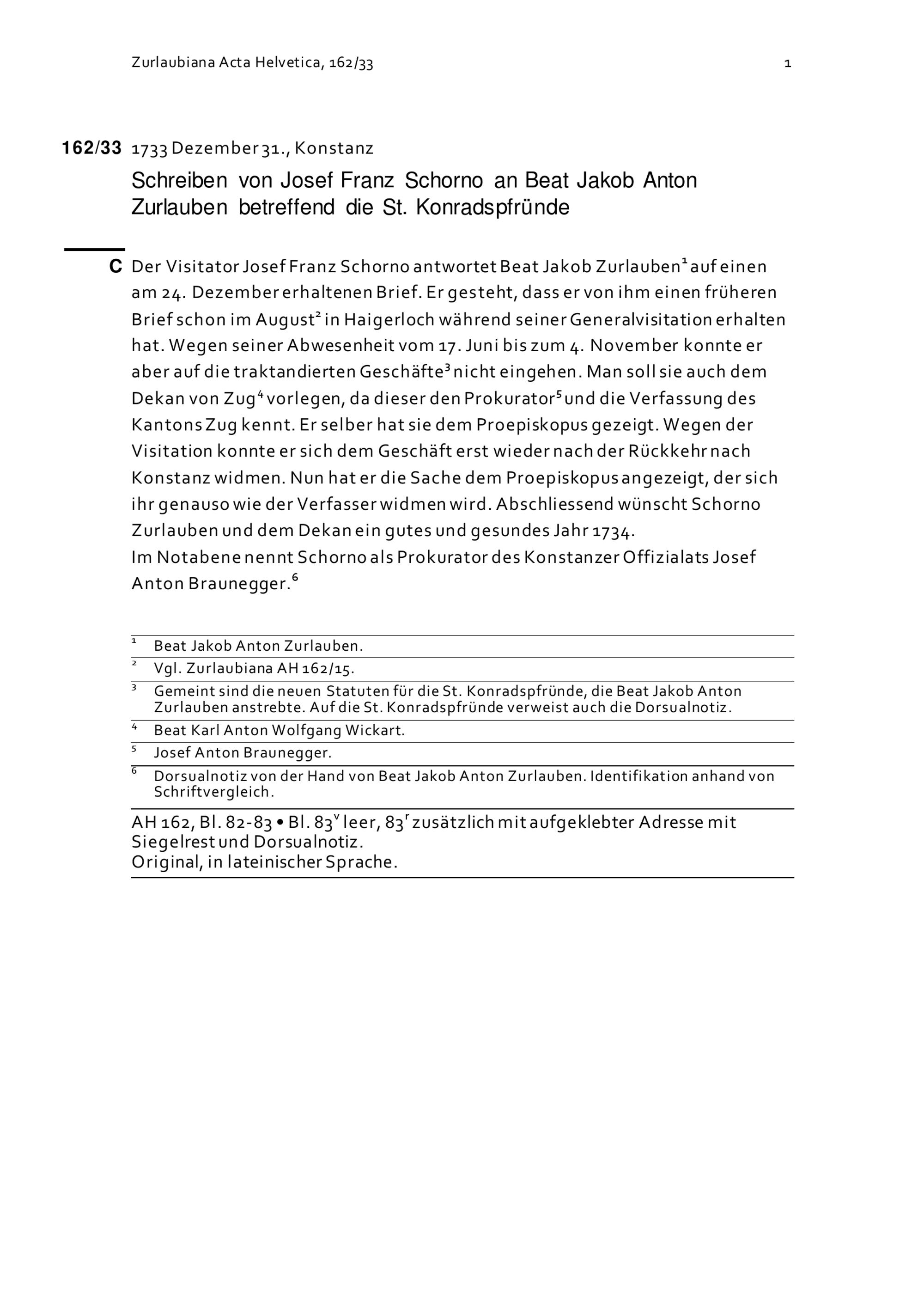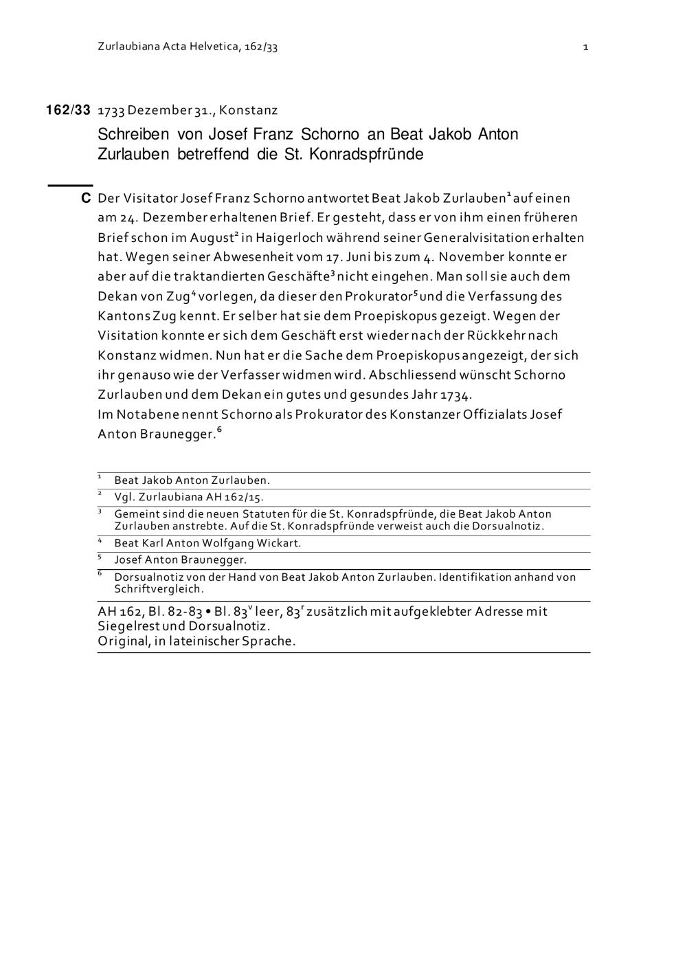 Schreiben von Josef Franz Schorno an Beat Jakob Anton Zurlauben betreffend die Sankt-Konradspfrund