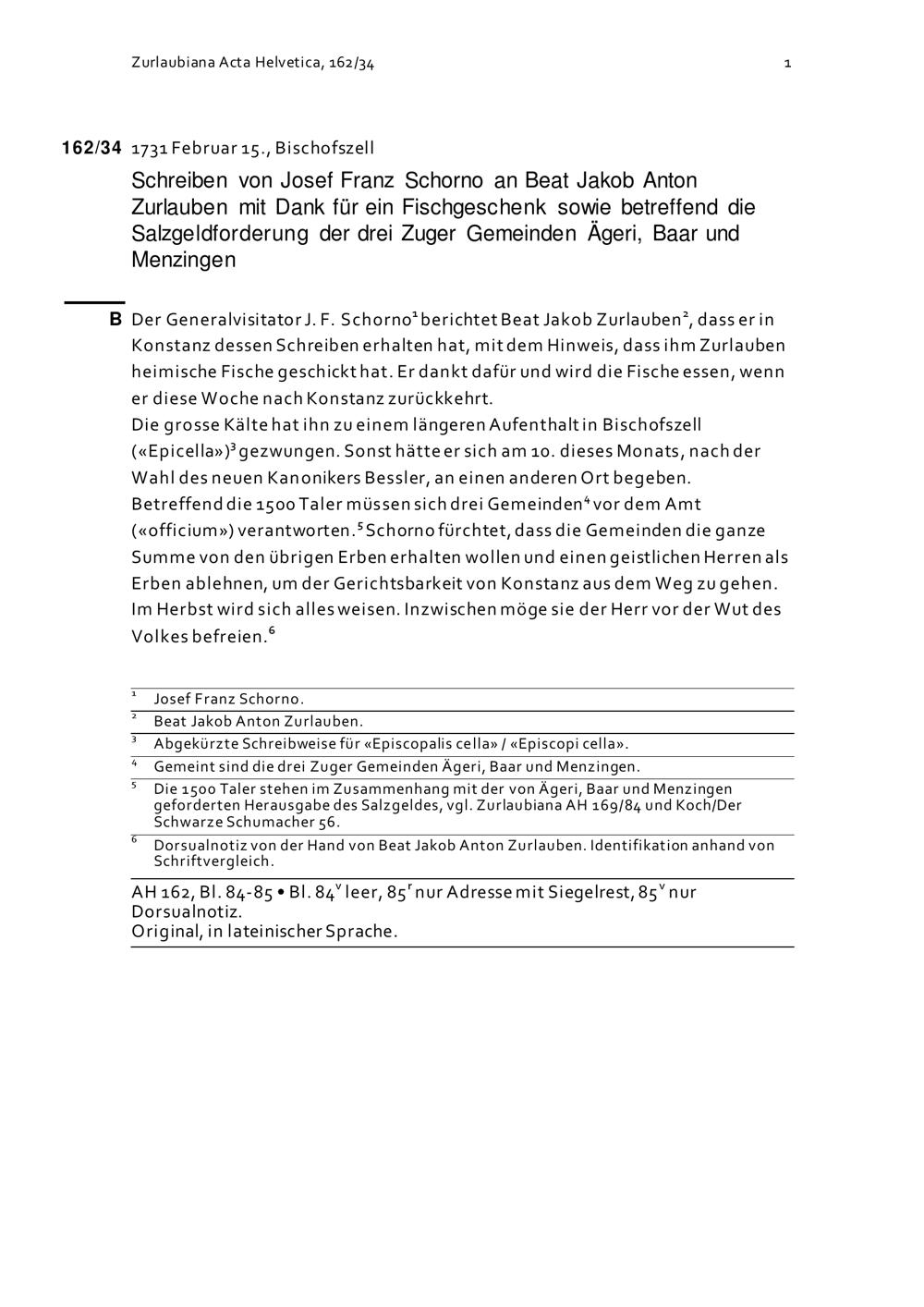 Schreiben von Josef Franz Schorno an Beat Jakob Anton Zurlauben mit Dank für ein Fischgeschenk sowie betreffend die Salzgeldforderung der drei Zuger Gemeinden Ägeri, Baar und Menzingen
