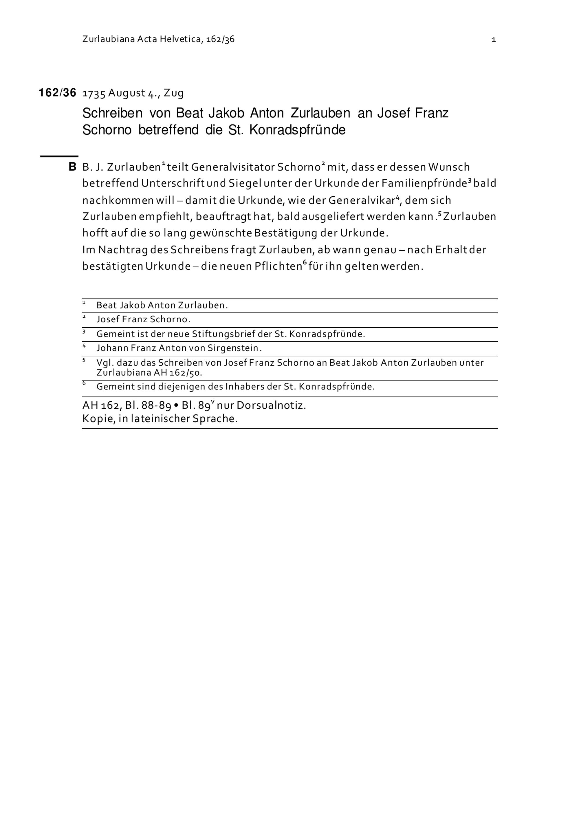 Schreiben von Josef Franz Schorno an Beat Jakob Anton Zurlauben betreffend die Sankt-Konradspfrund