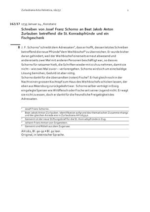 Schreiben von Josef Franz Schorno an Beat Jakob Anton Zurlauben betreffend die Sankt-Konradspfrund und ein Fischgeschenk