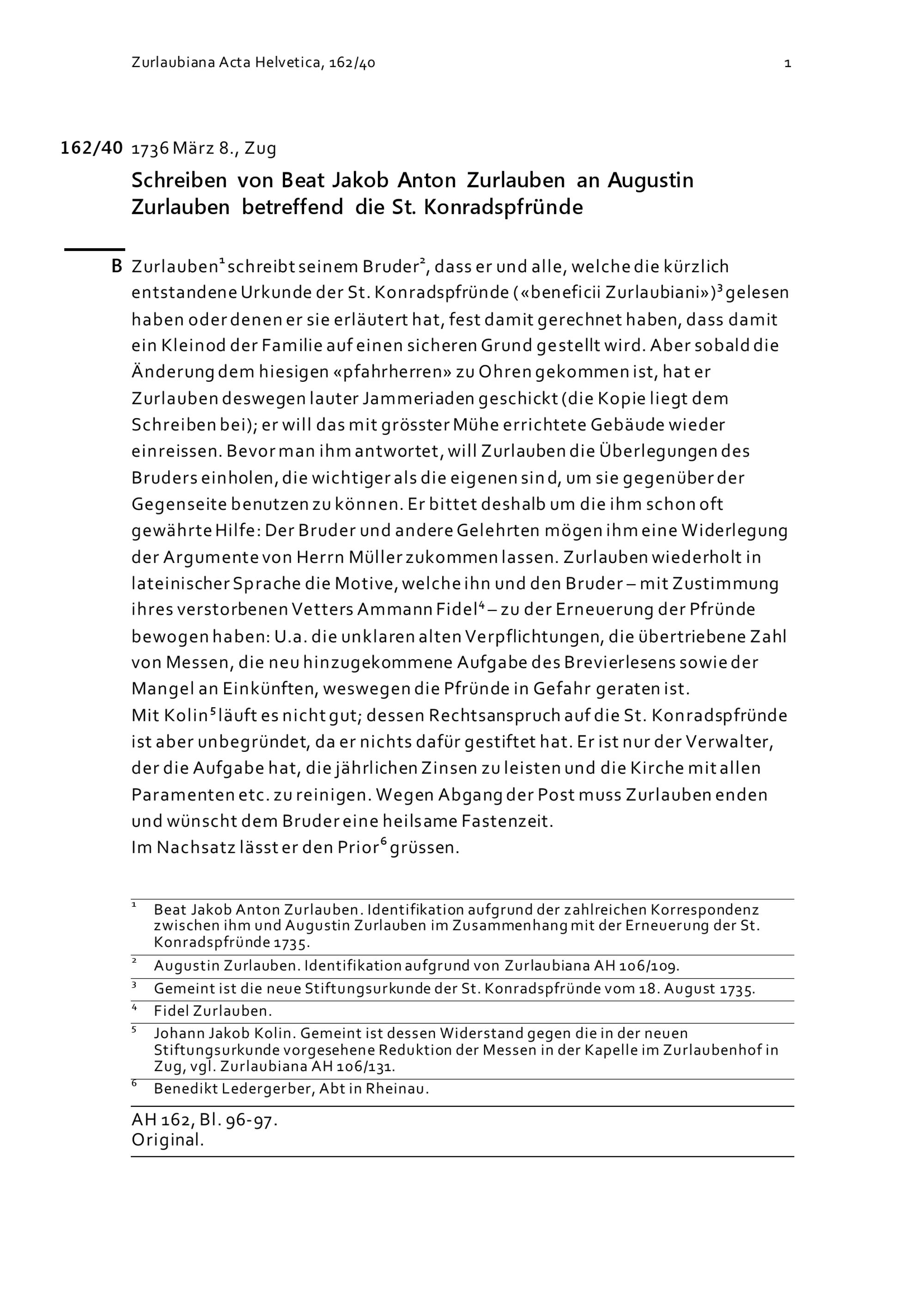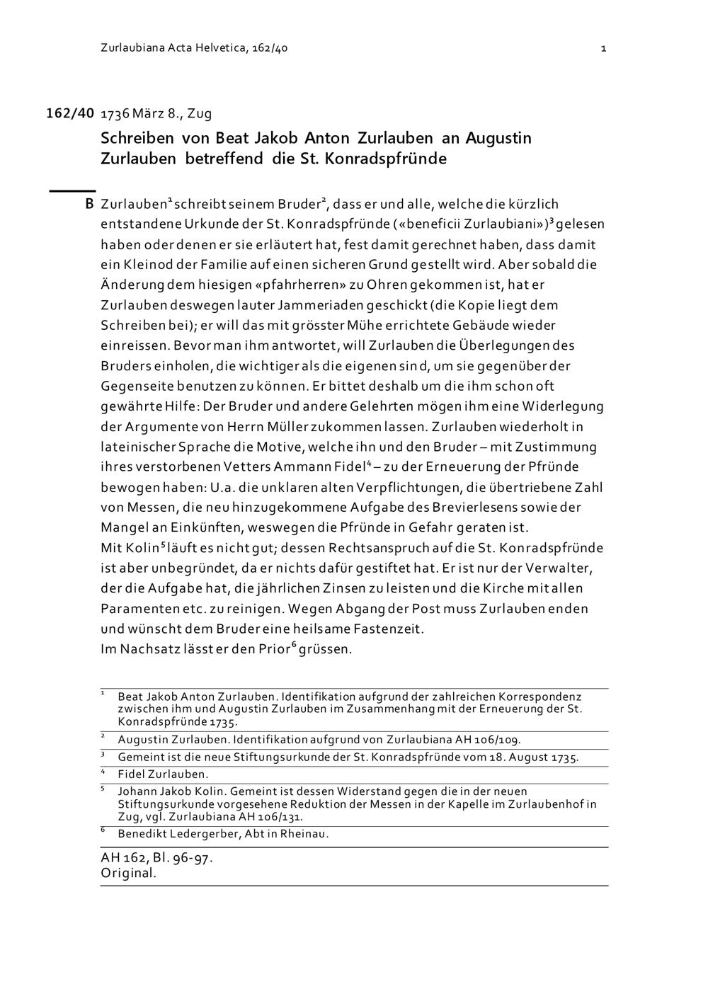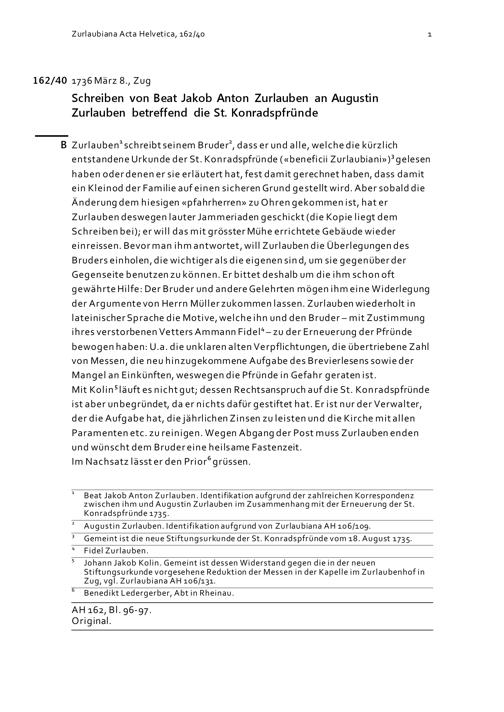 Schreiben von Beat Jakob Anton Zurlauben an Augustin Zurlauben betreffend die Sankt-Konradspfrund