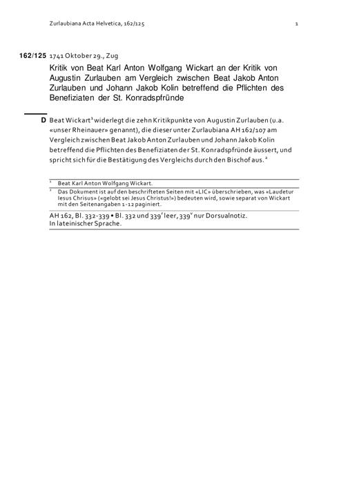 Kritik von Beat Karl Anton Wolfgang Wickart an der Kritik von Augustin Zurlauben am Vergleich zwischen Beat Jakob Anton Zurlauben und Johann Jakob Kolin betreffend die Pflichten des Benefiziaten der Sankt-Konradspfrund
