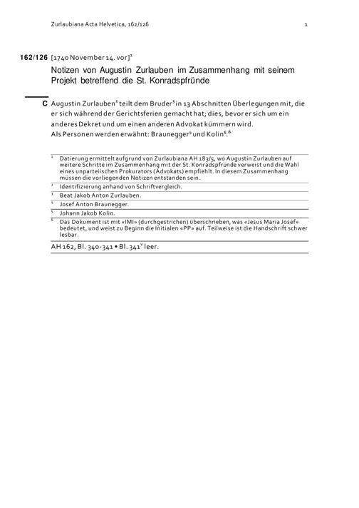 Notiz von Augustin Zurlauben in Zusammenhang mit seinem Projekt betreffend die Sankt-Konradspfrund