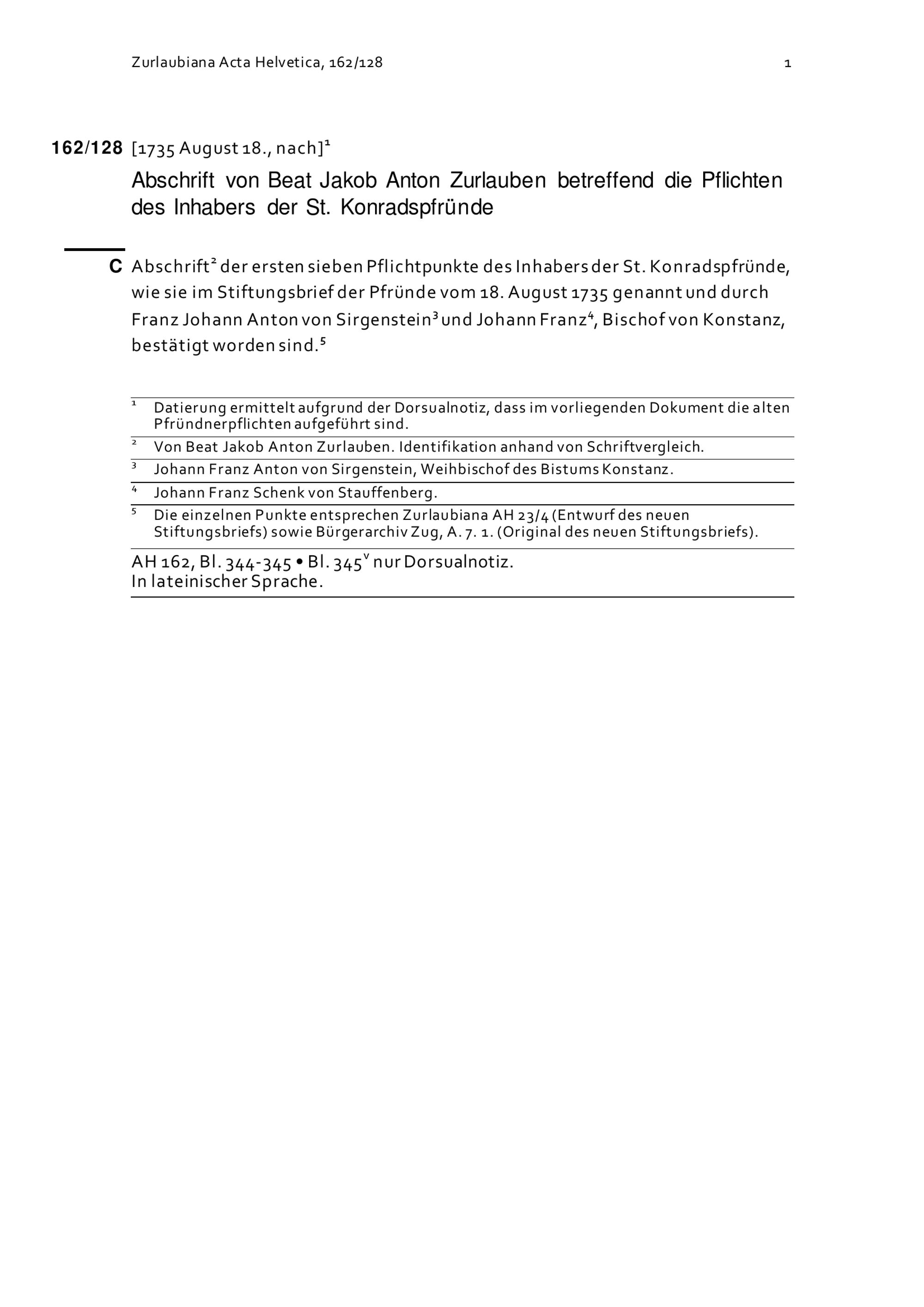 Abschrift von Beat Jakob Anton Zurlauben betreffend die Pflichten des Inhabers der Sankt-Konradspfrund