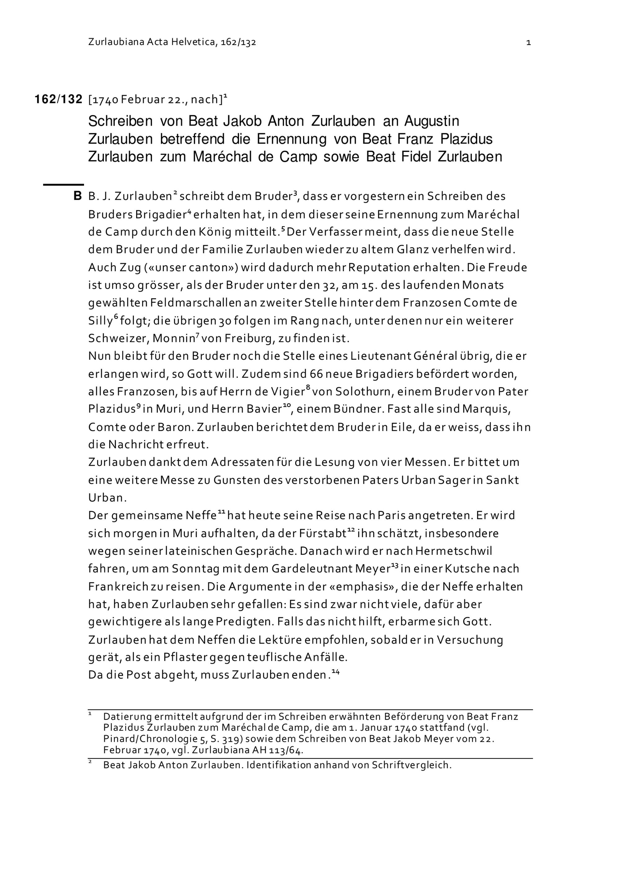 Schreiben von Beat Jakob Anton Zurlauben an Augustin Zurlauben betreffend die Ernennung von Beat Franz Plazidus Zurlauben zum Maréchal de Camp sowie Beat Fidel Zurlauben