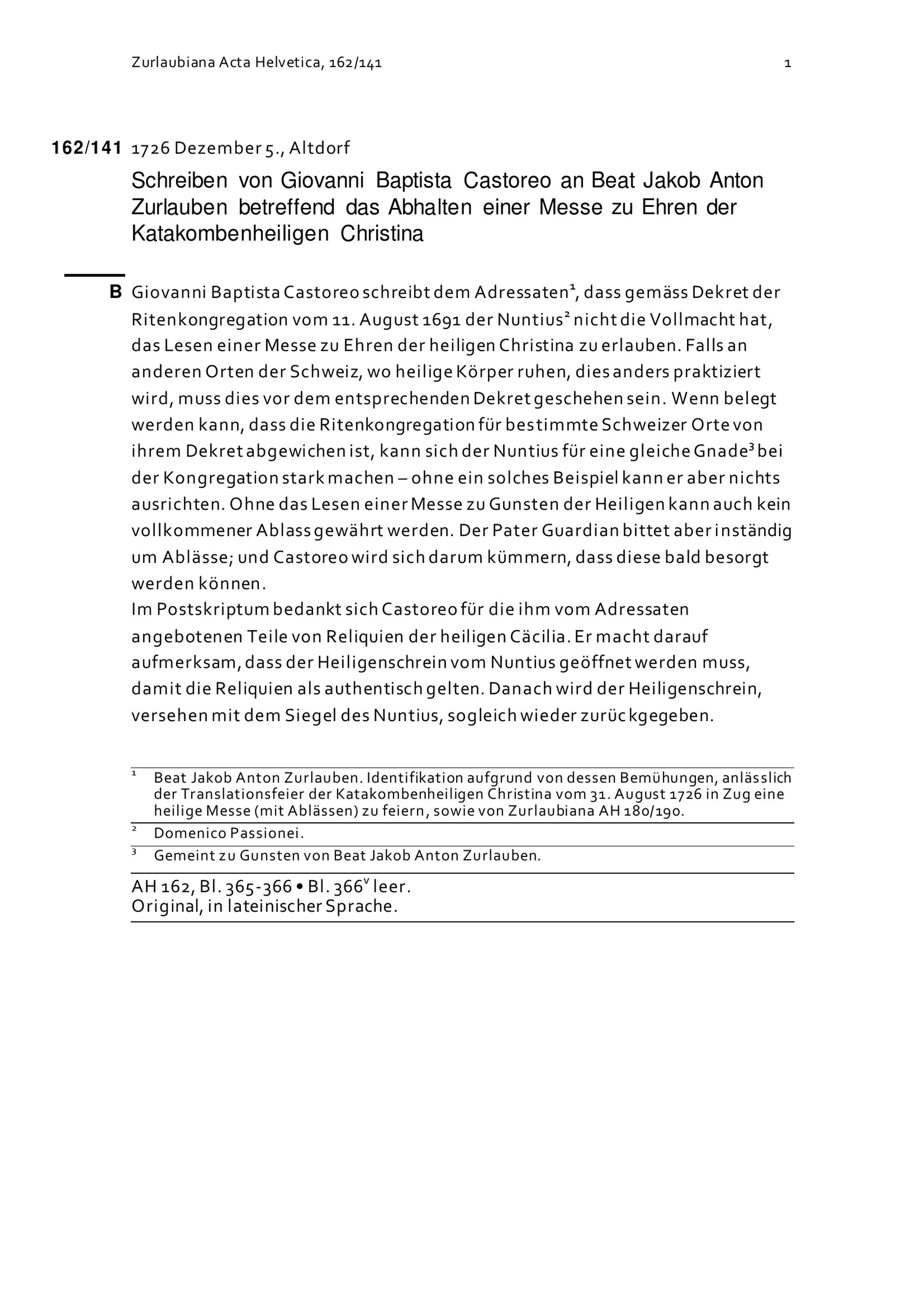 Schreiben von Johann Baptist Castoreo an Beat Jakob Anton Zurlauben betreffend das Abhalten einer Messe zu Ehren der Katakombenheiligen Christina