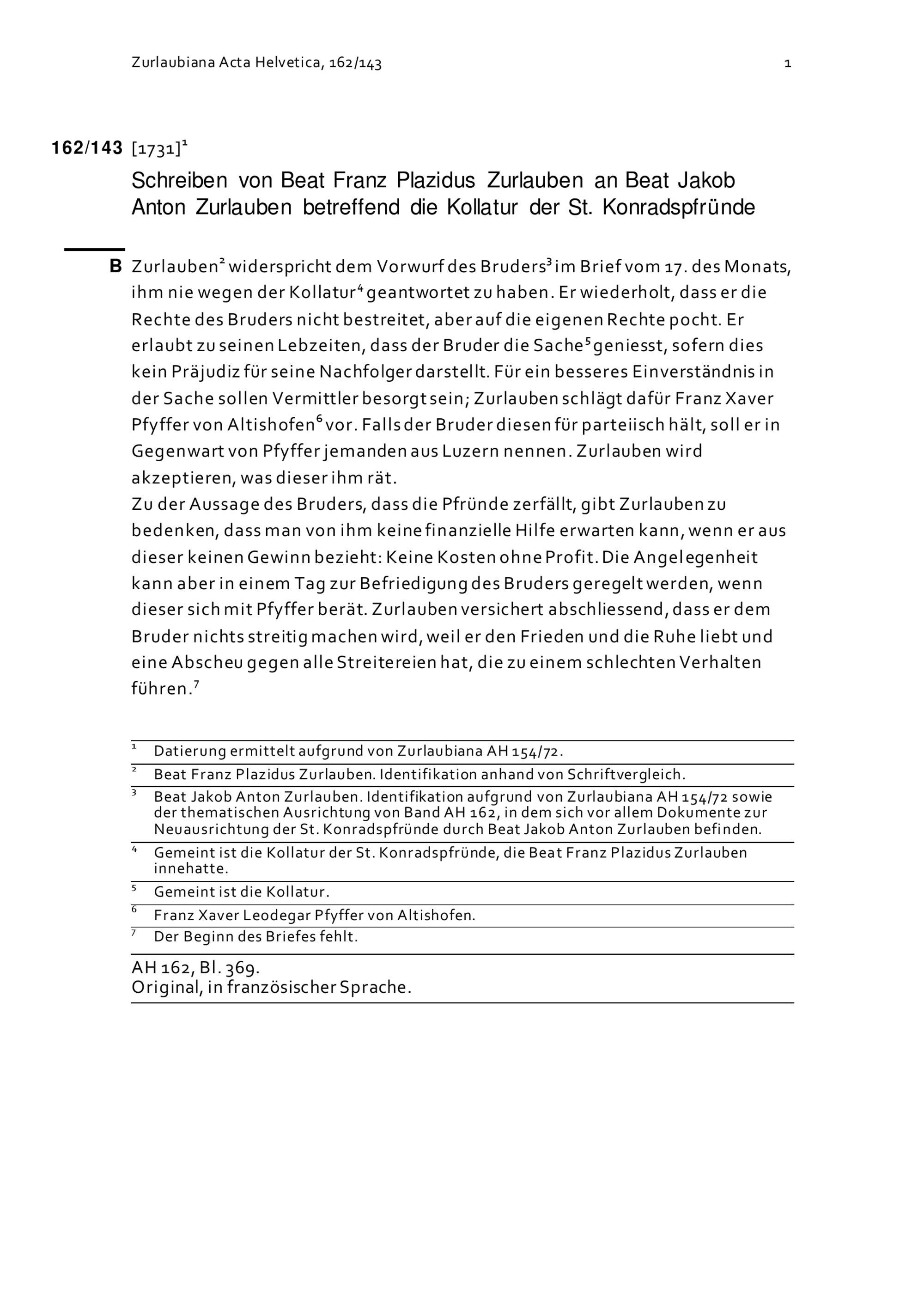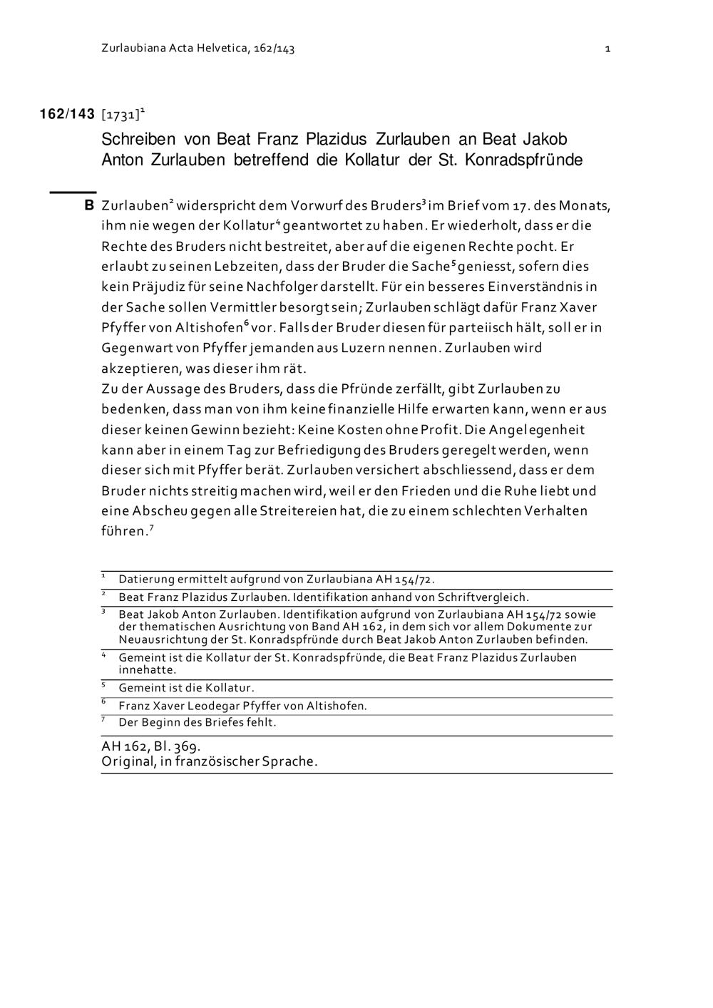 Schreiben von Beat Franz Plazidus Zurlauben an Beat Jakob Anton Zurlauben betreffend die Kollatur der Sankt-Konradspfrund