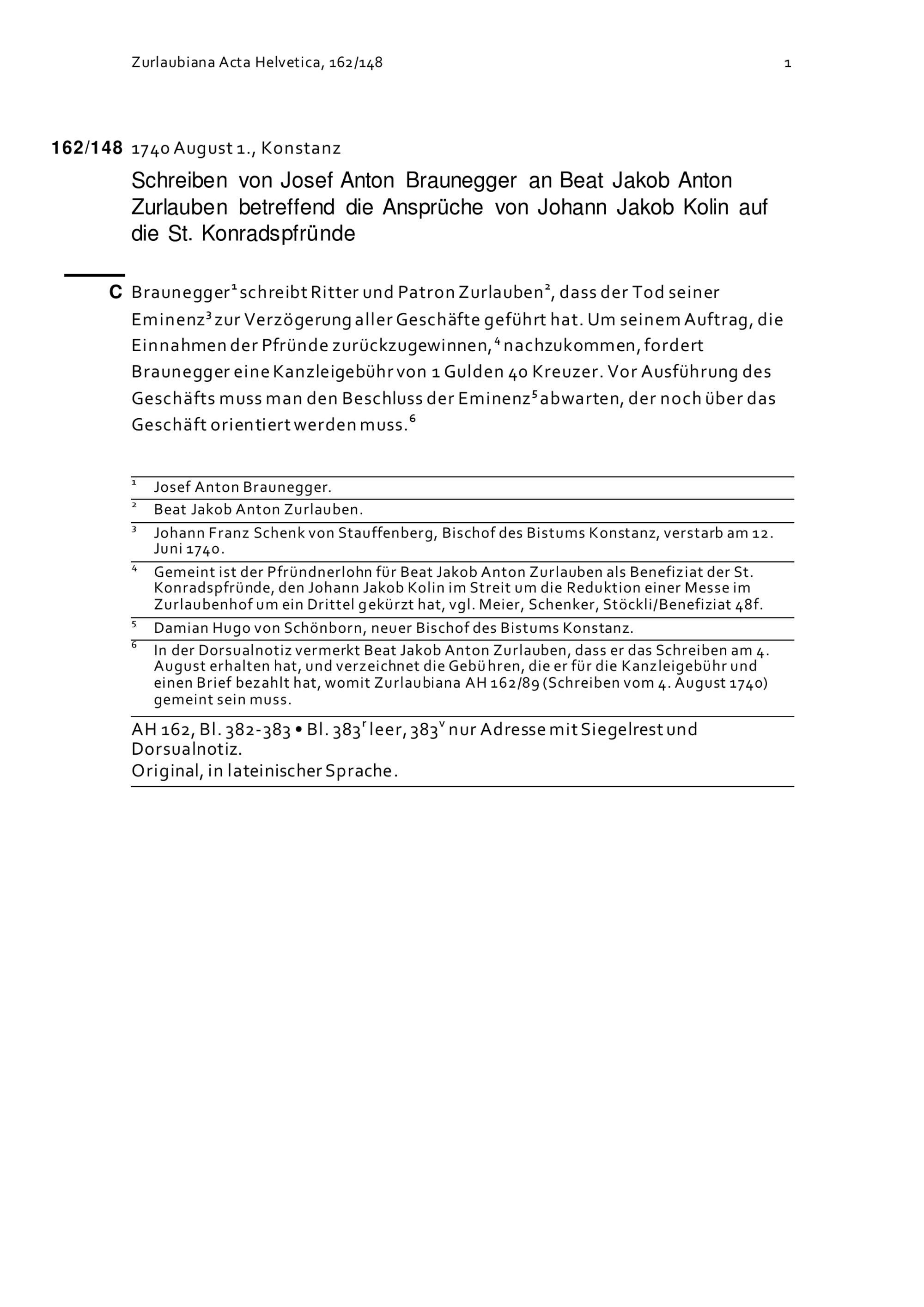 Schreiben von Josef Anton Braunegger an Beat Jakob Zurlauben betreffend die Ansprüche von Johann Jakob Kolin auf die Sankt-Konradspfrund