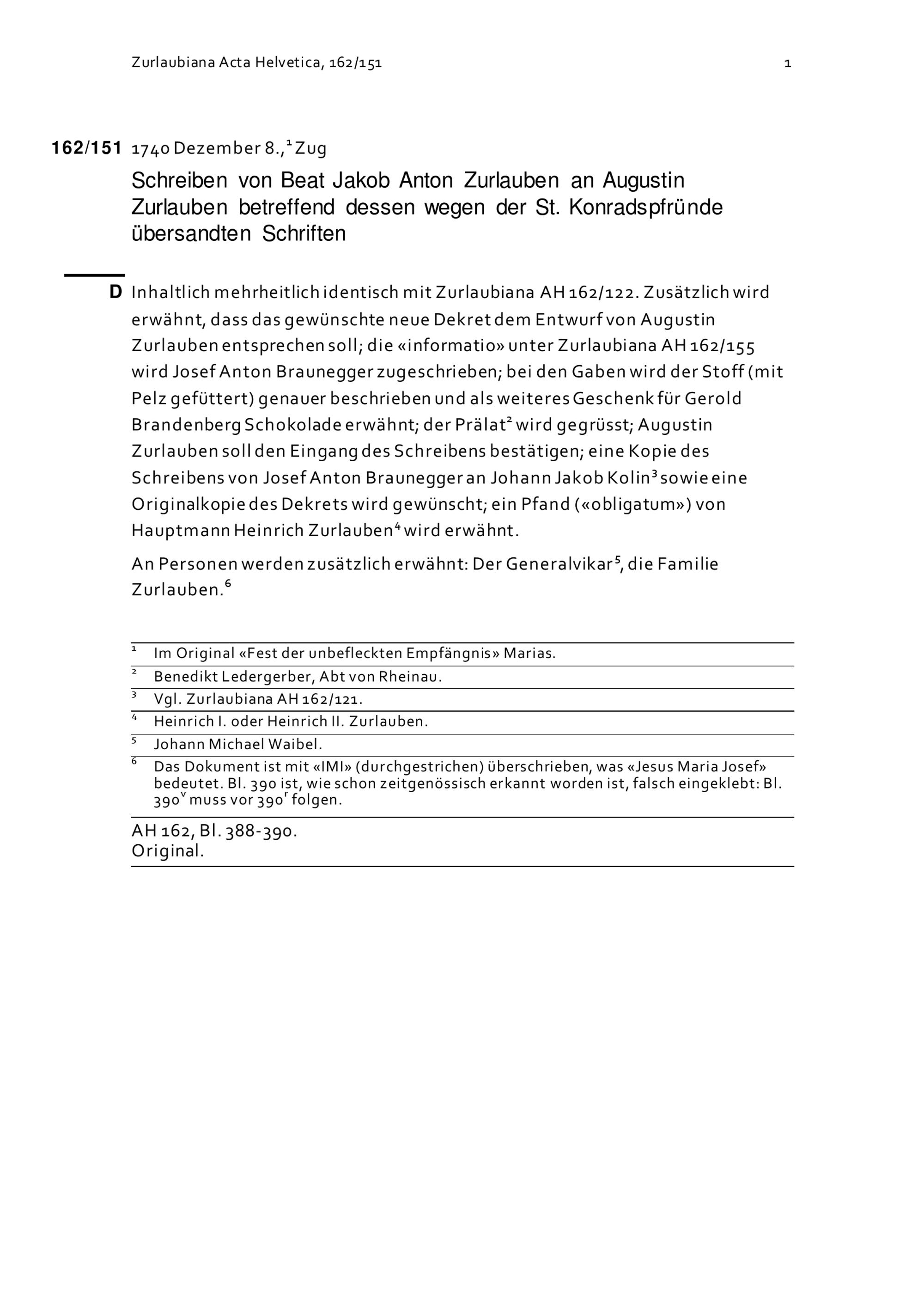 Schreiben von Beat Jakob Anton Zurlauben an Augustin Zurlauben betreffend dessen wegen der Sankt-Konradspfrund übersandten Schriften