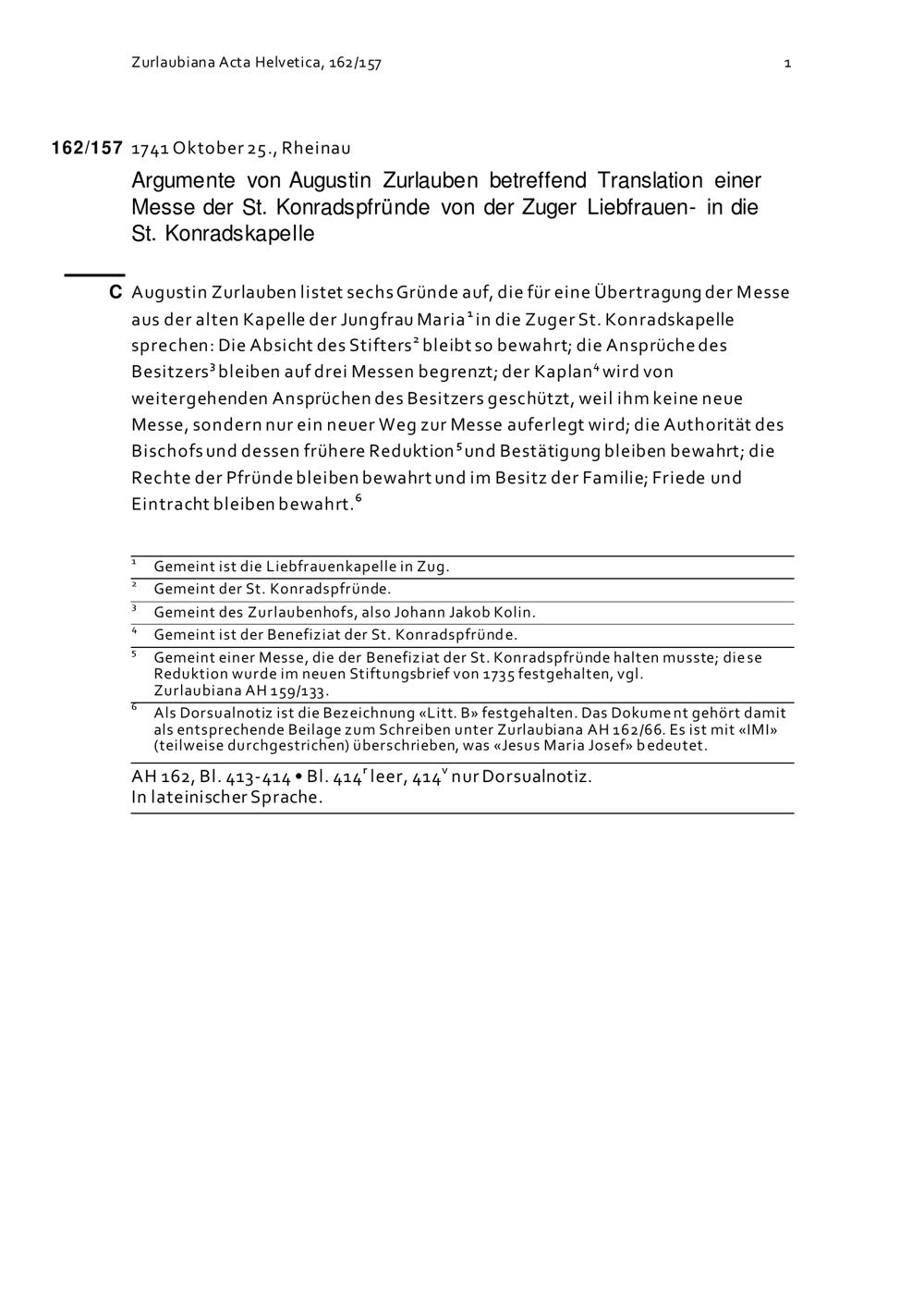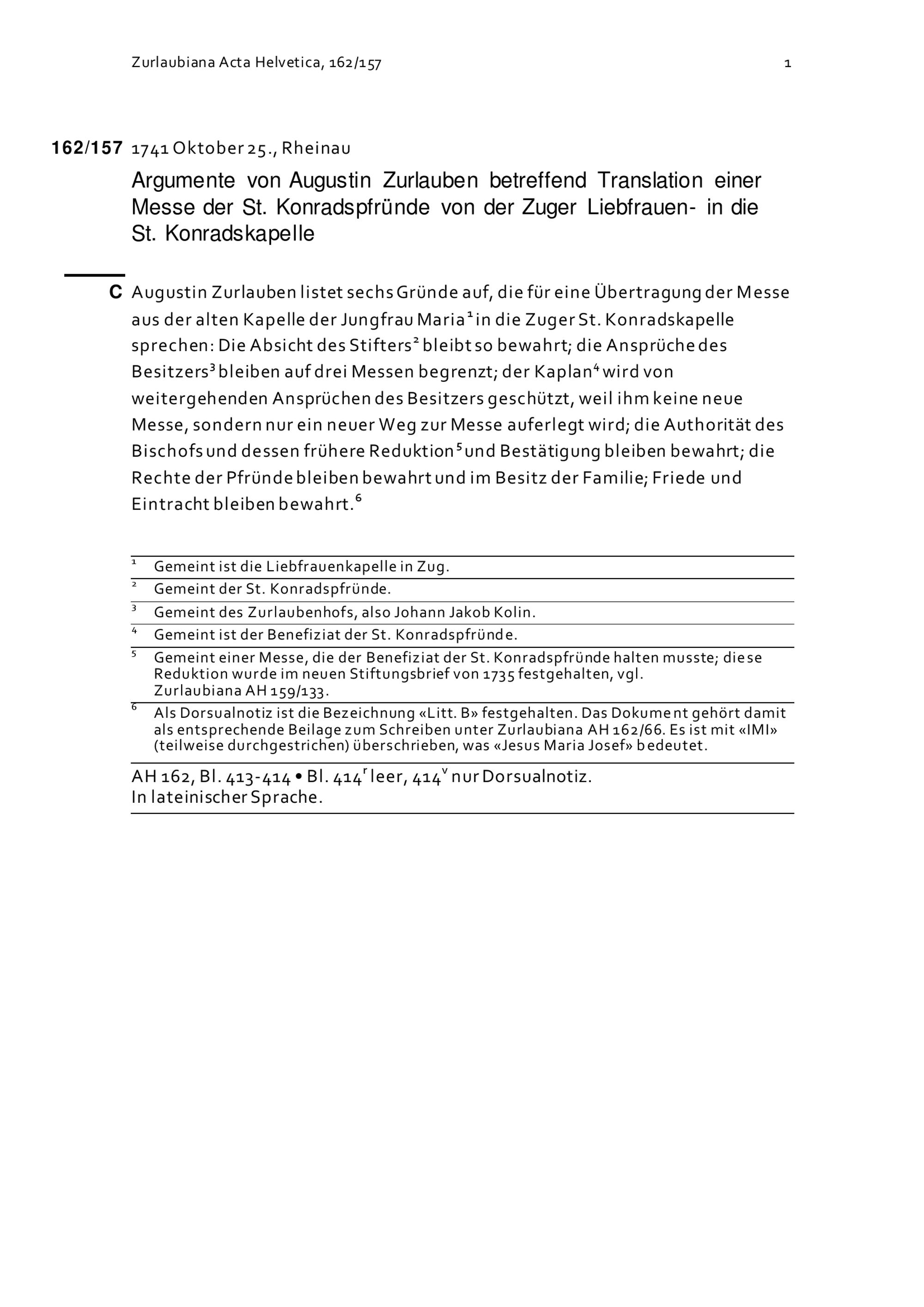 Argumente von Augustin Zurlauben betreffend Translation einer Messe der Sankt-Konradspfrund von der Zuger Liebfrauen- in die Sankt-Konradskapelle