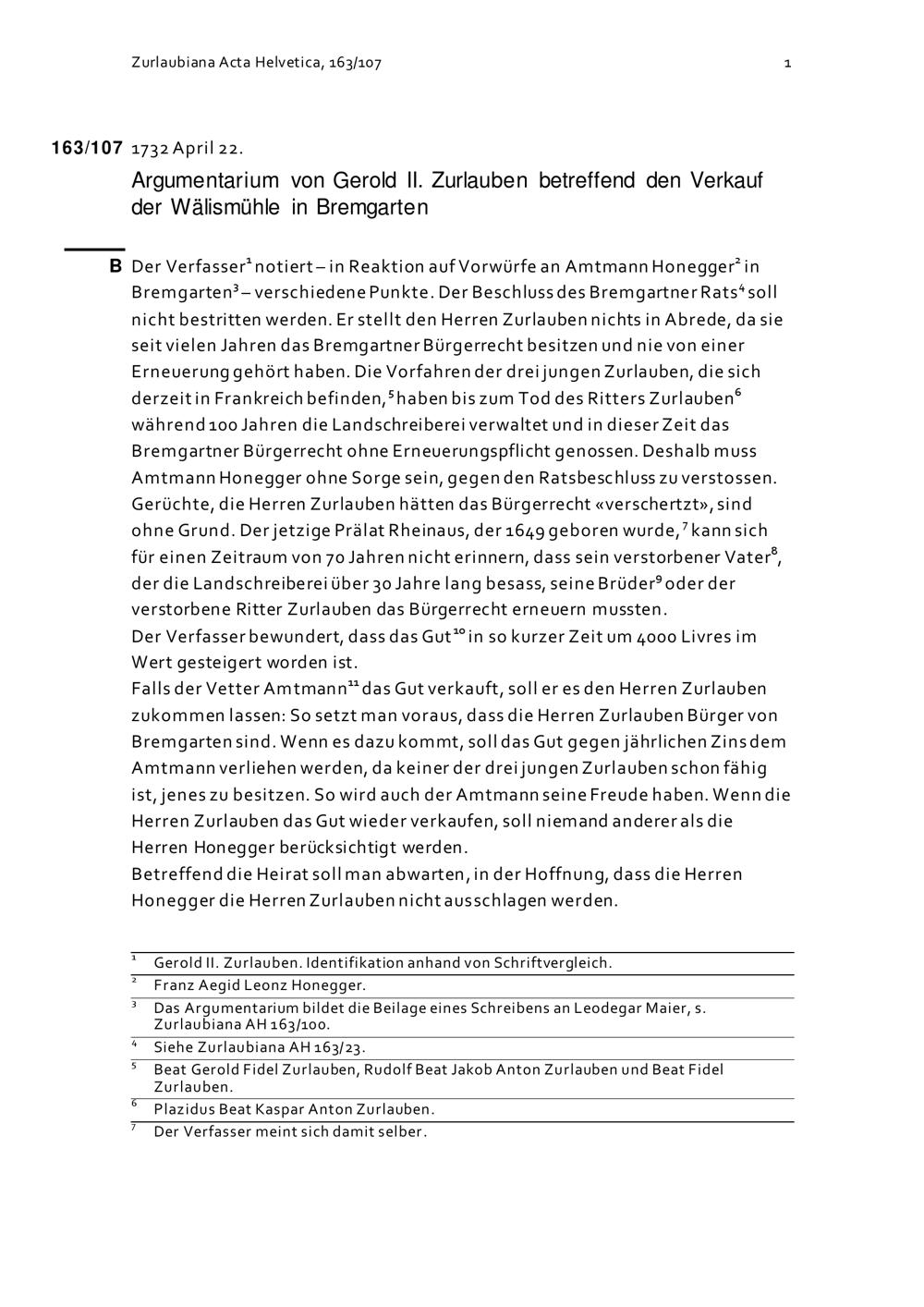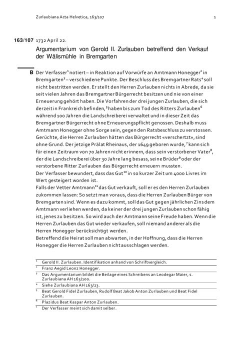 Argumentarium von Gerold II. Zurlauben betreffend den Verkauf der Wälismühle in ...