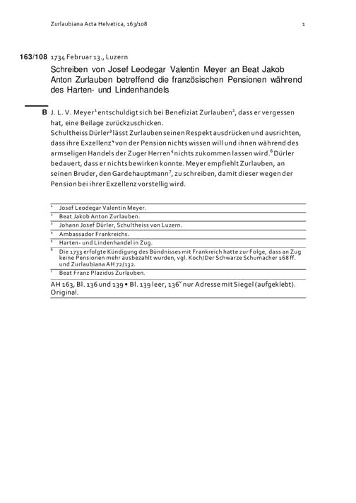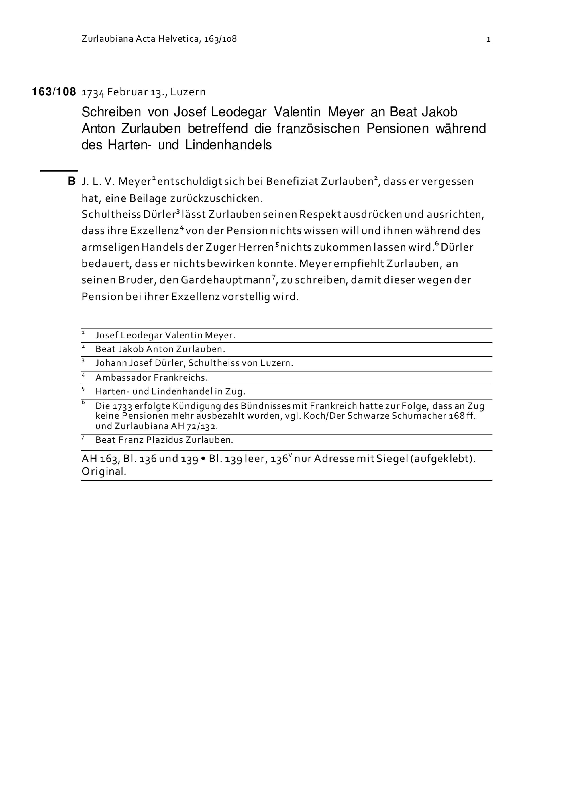 Schreiben von Josef Leodegar Valentin Meyer an Beat Jakob Anton Zurlauben betreffend die französischen Pensionen während des Harten- und Lindenhandels