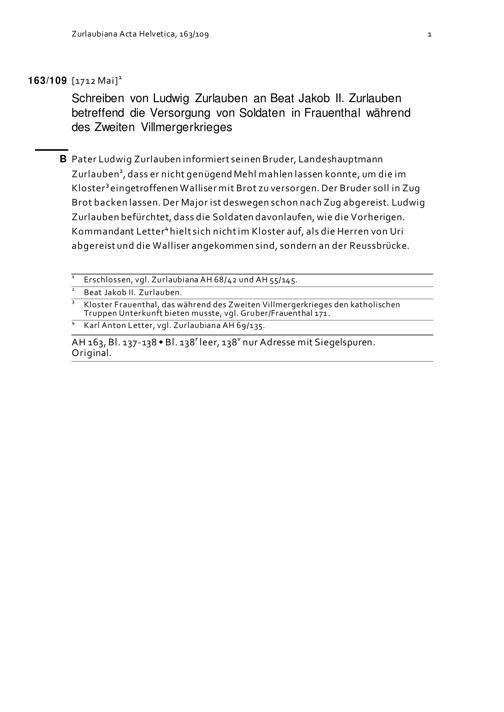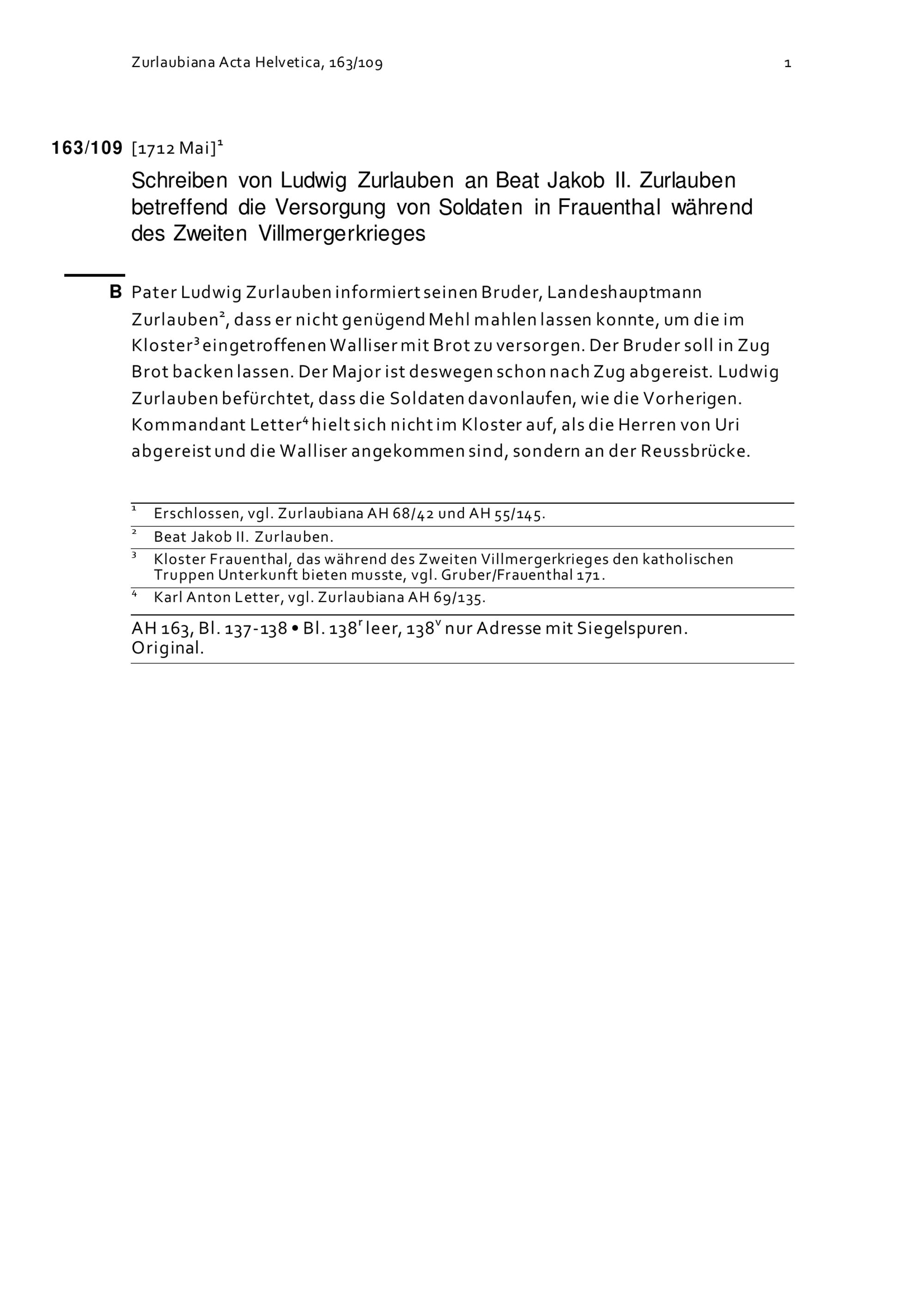 Schreiben von Ludwig Zurlauben an Beat Jakob II. Zurlauben betreffend die Versorgung von Soldaten im Frauenkloster Frauenthal während des Zweiten Villmergerkriegs