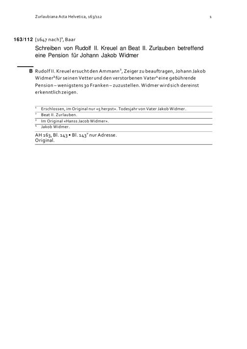 Schreiben von Rudolf II. Kreuel an Beat II. Zurlauben betreffend eine Pension für Johann Jakob Widmer