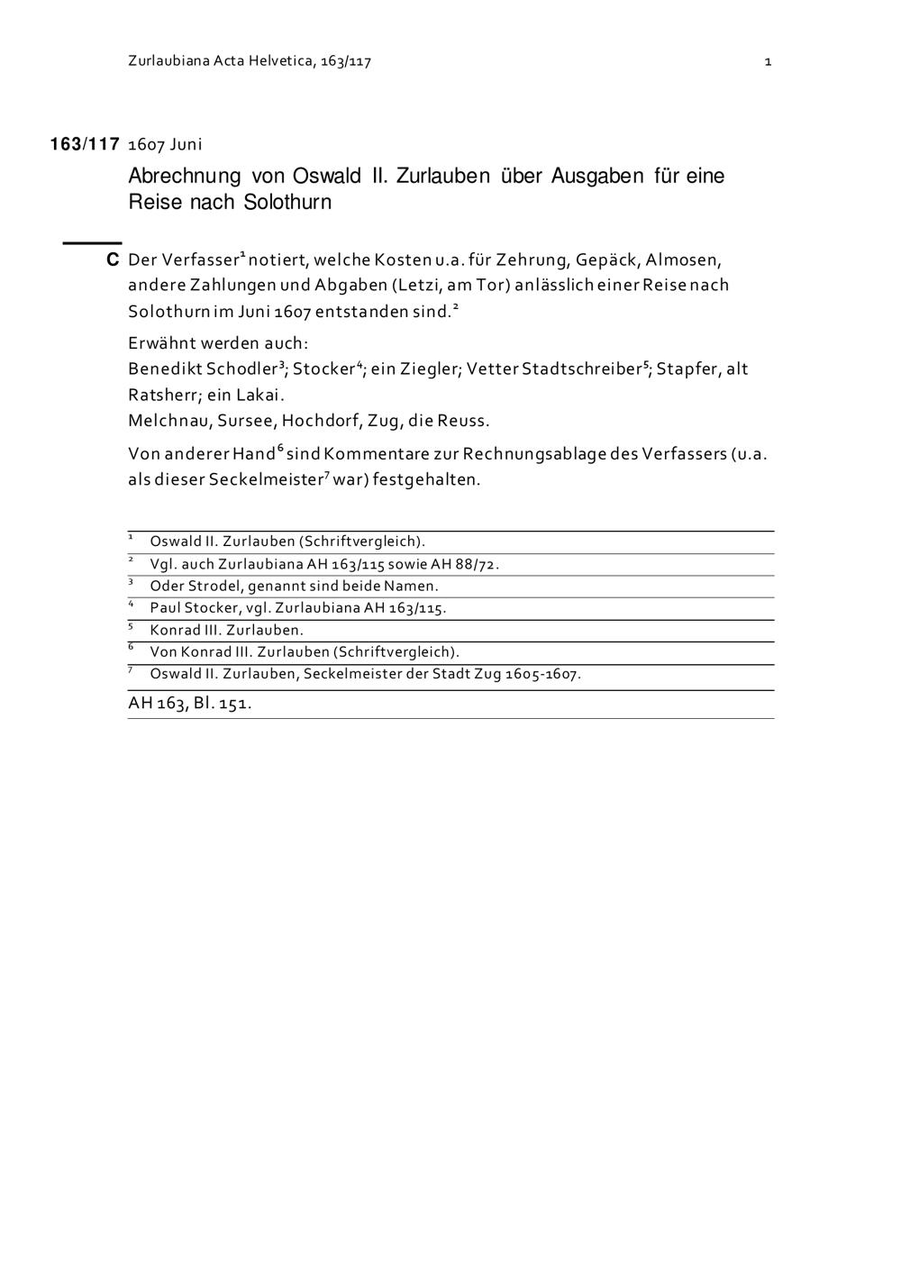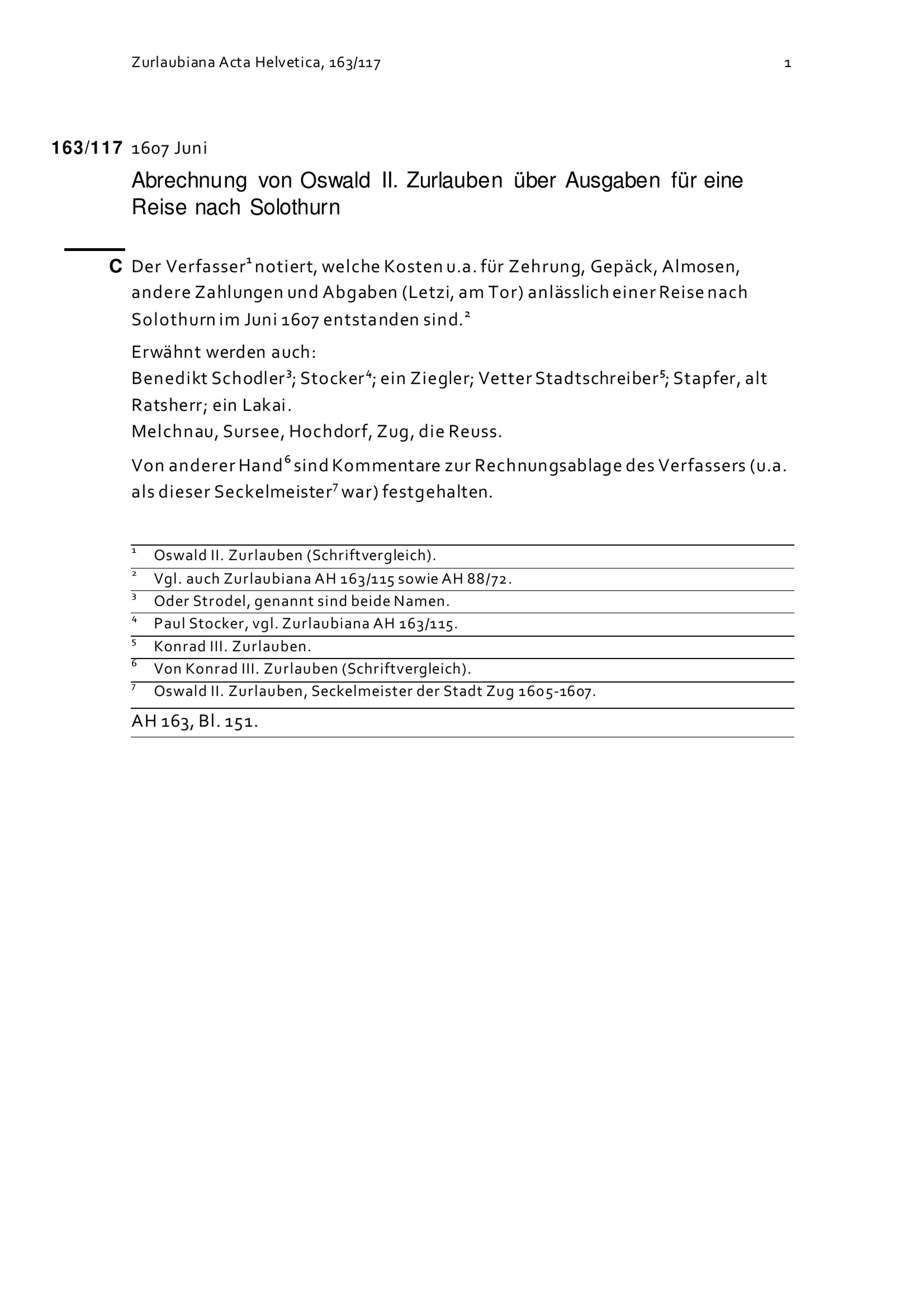 Abrechnung von Oswald II. Zurlauben betreffend Ausgaben für eine Reise nach Solothurn