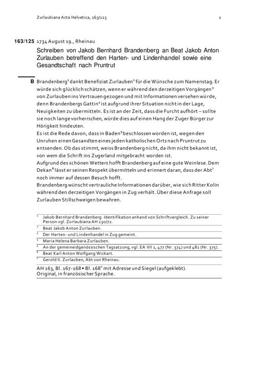 Schreiben von Jakob Bernhard Brandenberg an Beat Jakob Anton Zurlauben betreffend den Harten- und Lindenhandel sowie eine Gesandtschaft nach Pruntrut