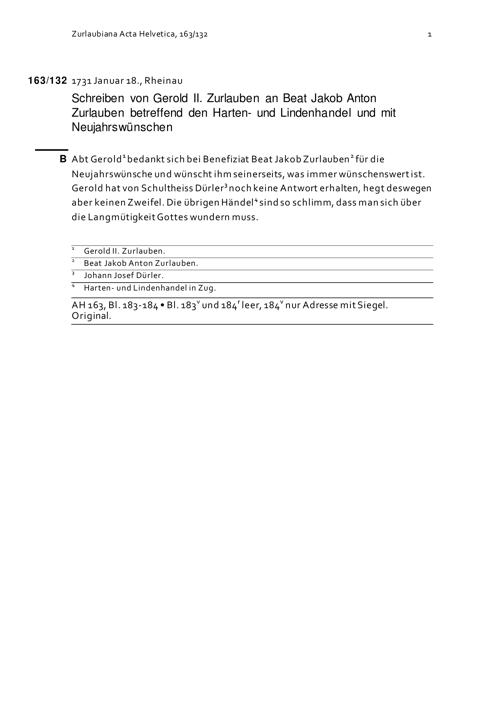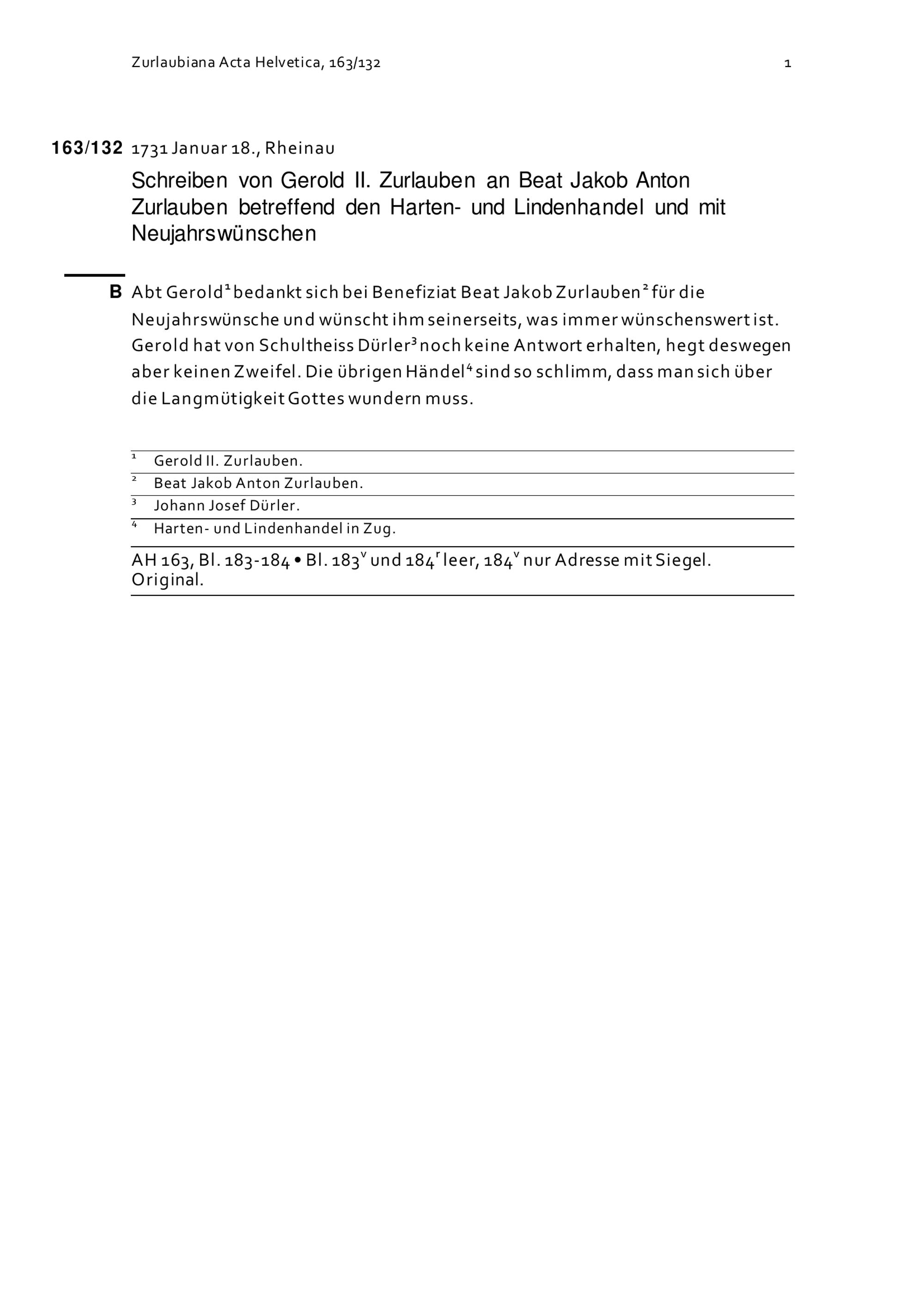 Schreiben von Gerold II. Zurlauben an Beat Jakob Anton Zurlauben betreffend den Harten- und Lindenhandel und mit Neujahrswünschen