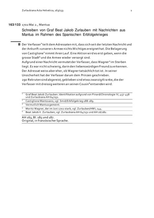 Schreiben von Beat Jakob Zurlauben mit Nachrichten aus Mantua im Rahmen des Spanischen Erbfolgekriegs