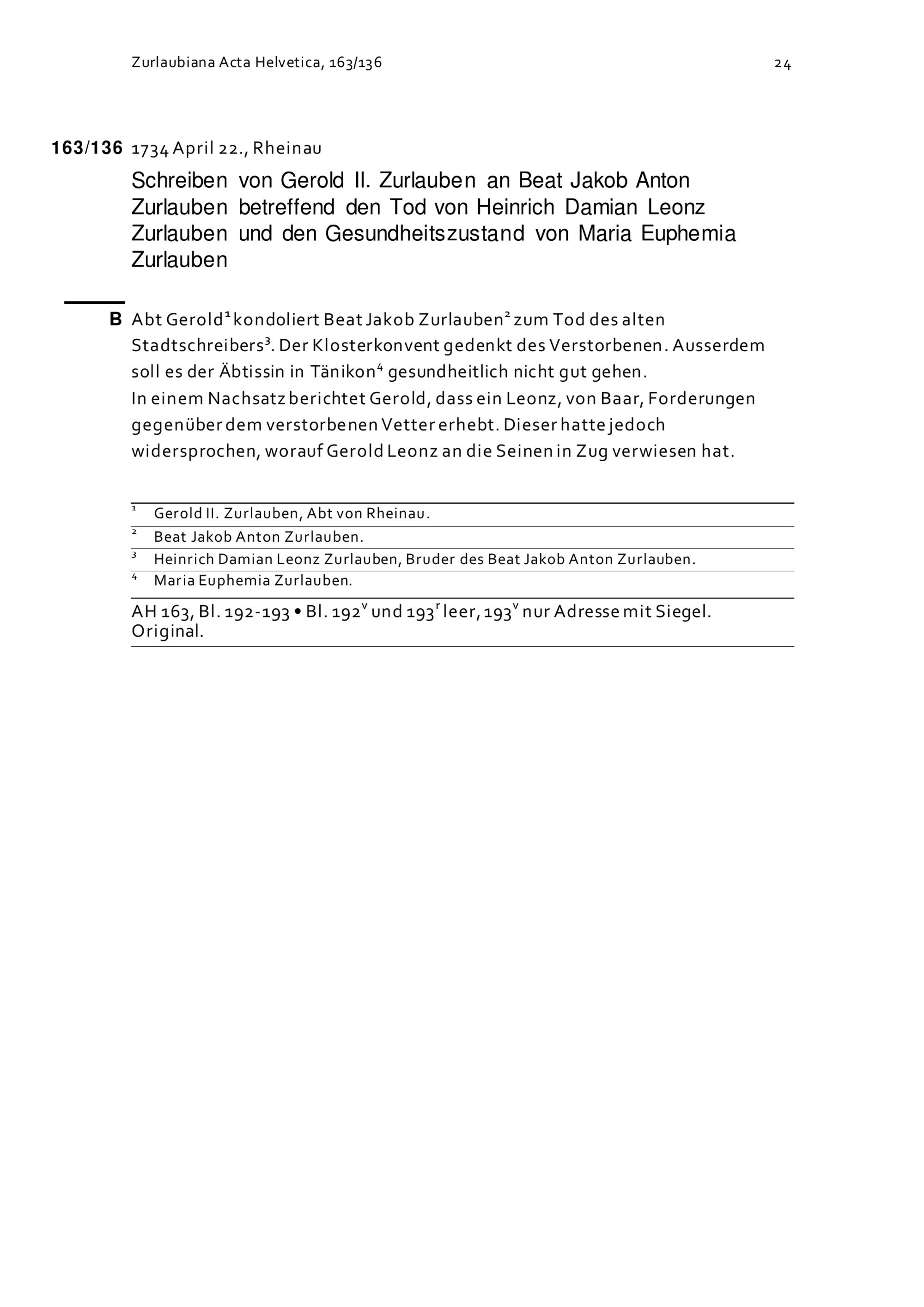 Schreiben von Gerold II. Zurlauben an Beat Jakob Anton Zurlauben betreffend den Tod von Heinrich Damian Leonz Zurlauben und den Gesundheitszustand von Maria Euphemia Zurlauben