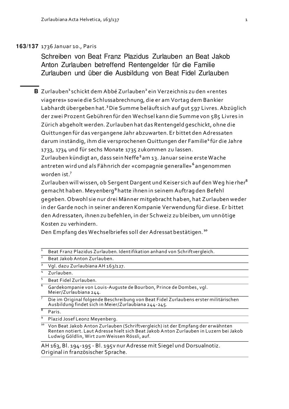 Schreiben von Beat Franz Plazidus Zurlauben an Beat Jakob Anton Zurlauben betreffend Rentengelder für die Familie Zurlauben und über die Ausbildung von Beat Fidel Zurlauben