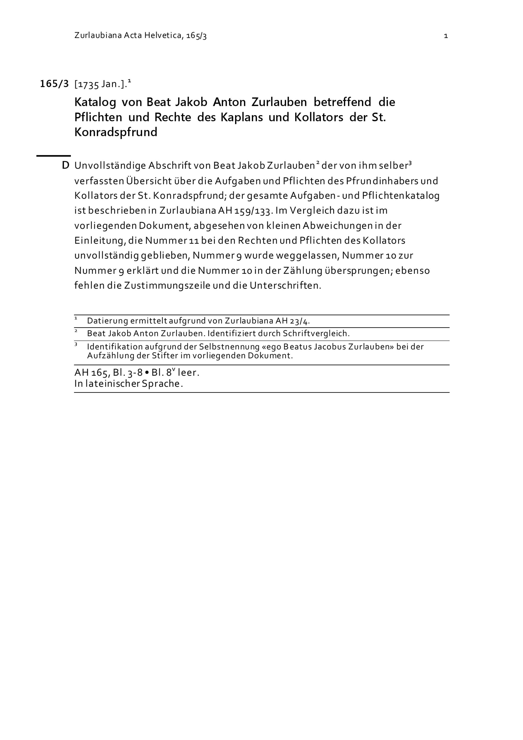 Katalog von Beat Jakob Anton Zurlauben betreffend die Pflichten und Rechte des Kaplans und Kollators der Sankt-Konradspfrund