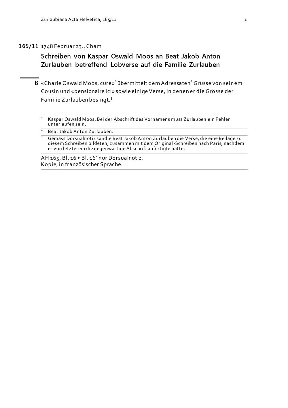 Schreiben von Kaspar Oswald Moos an Beat Jakob Anton Zurlauben betreffend Lobverse auf die Familie Zurlauben