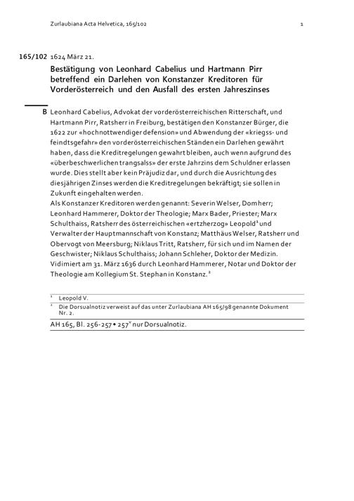 Bestätigung von Leonhard Cabelius und Hartmann Pirr betreffend ein Darlehen von Konstanzer Kreditoren für Vorderösterreich und den Ausfall des ersten Jahreszinses
