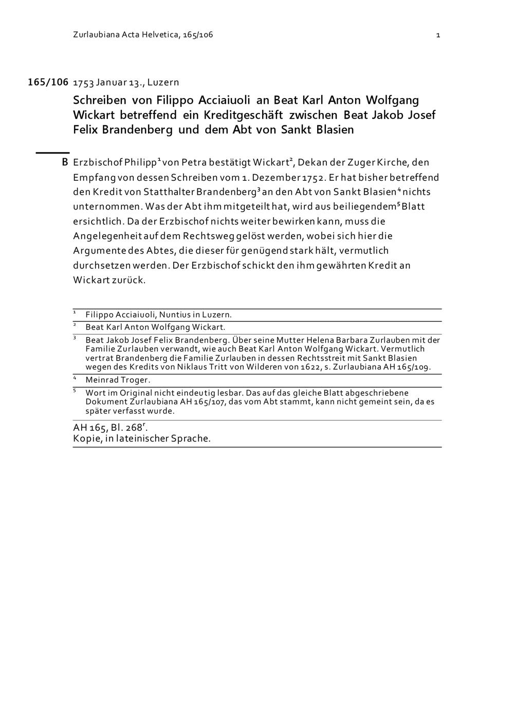 Schreiben von Filippo Acciaiuoli an Beat Karl Anton Wolfgang Wickart betreffend ein Kreditgeschäft zwischen Beat Jakob Josef Felix Brandenberg und dem Abt von Sankt Blasien