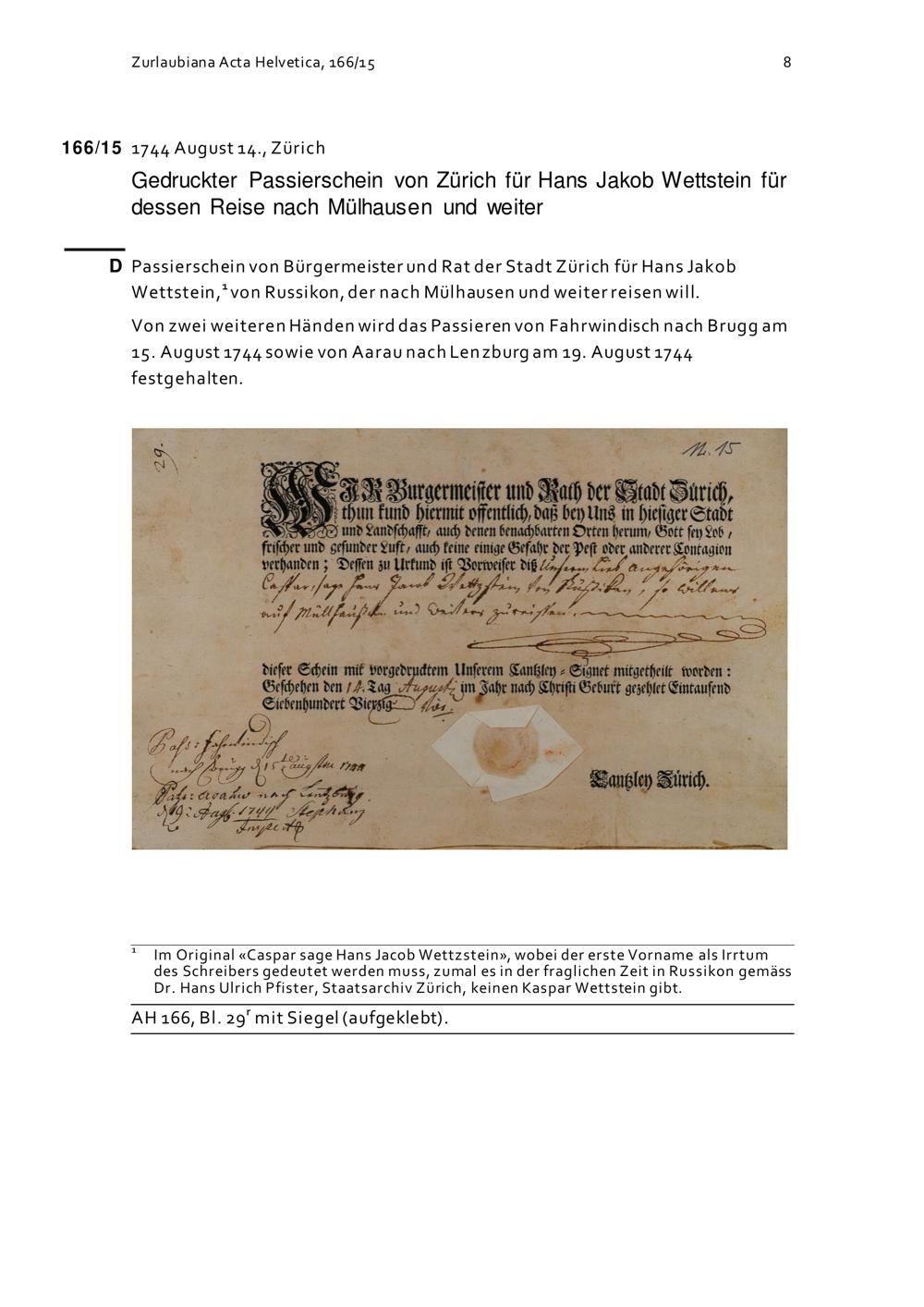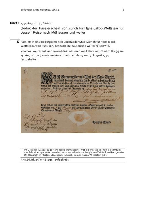Druck: Passierschein von Zürich für Hans Jakob Wettstein für dessen Reise nach Mülhausen und weiter