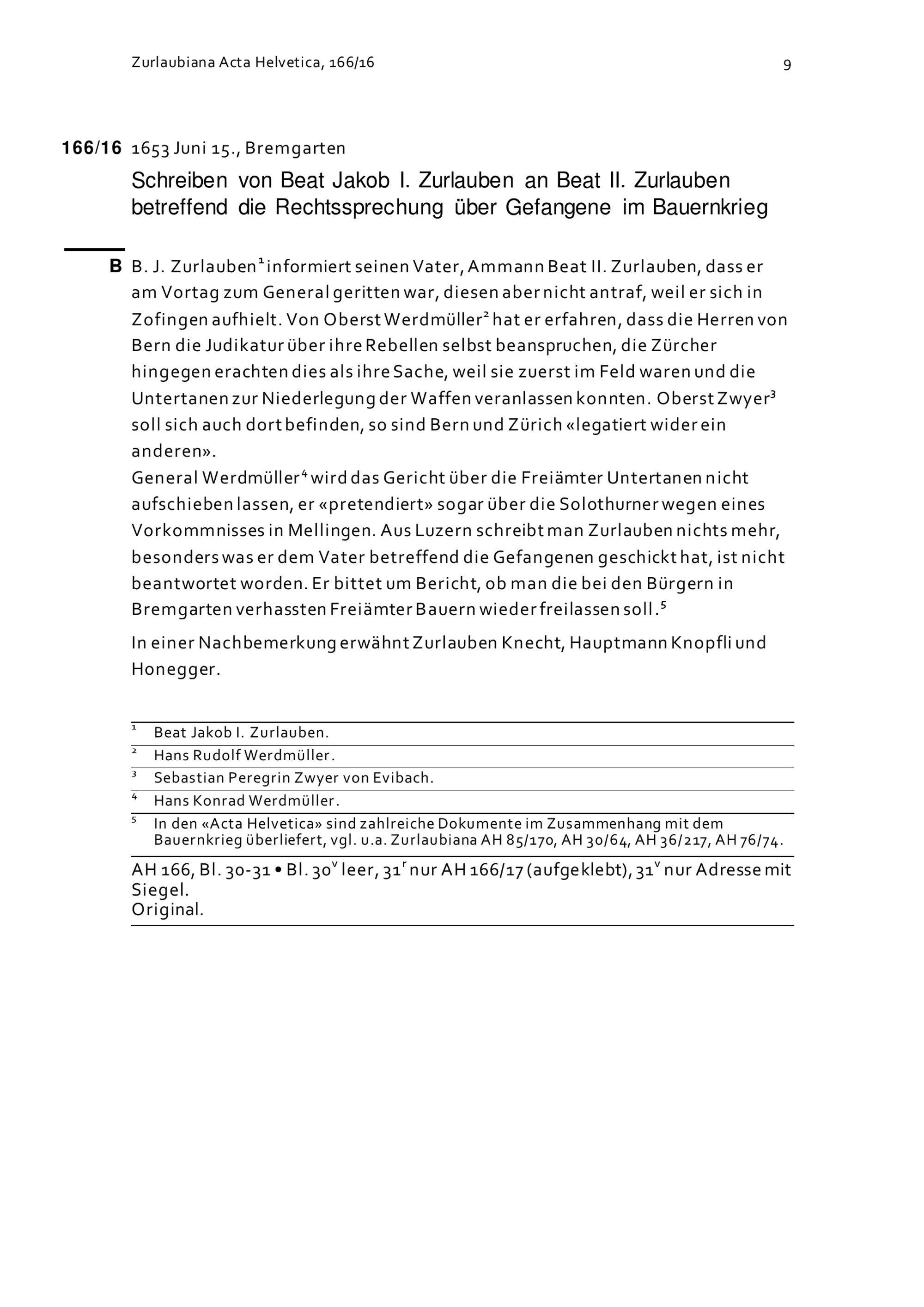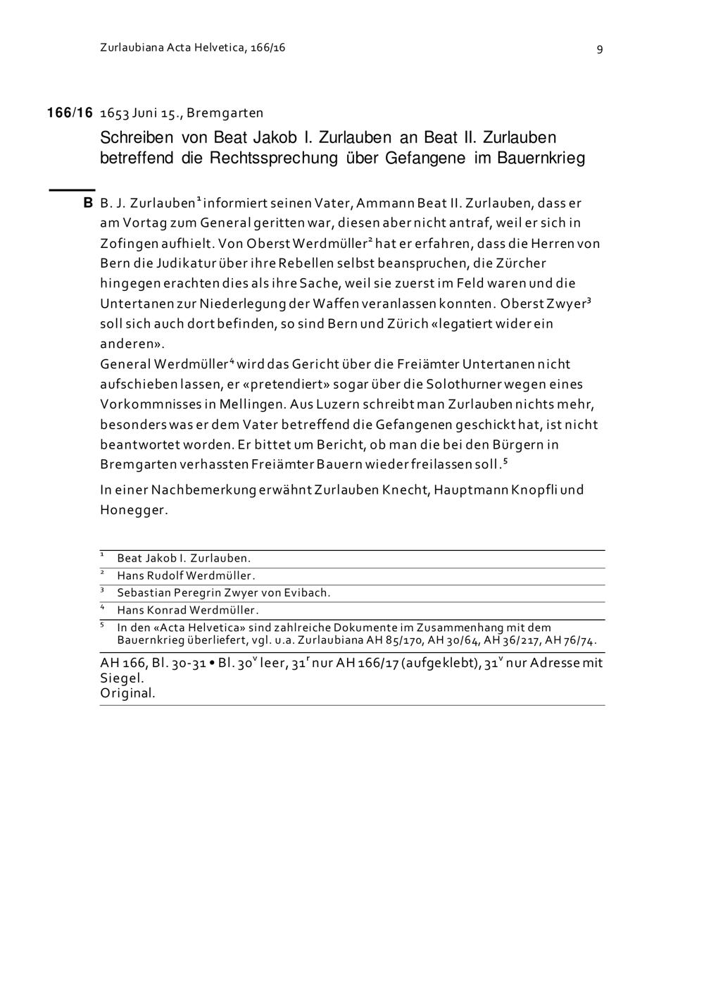Schreiben von Beat Jakob I. Zurlauben an Beat II. Zurlauben betreffend die Rechtssprechung über Gefangene im Bauernkrieg