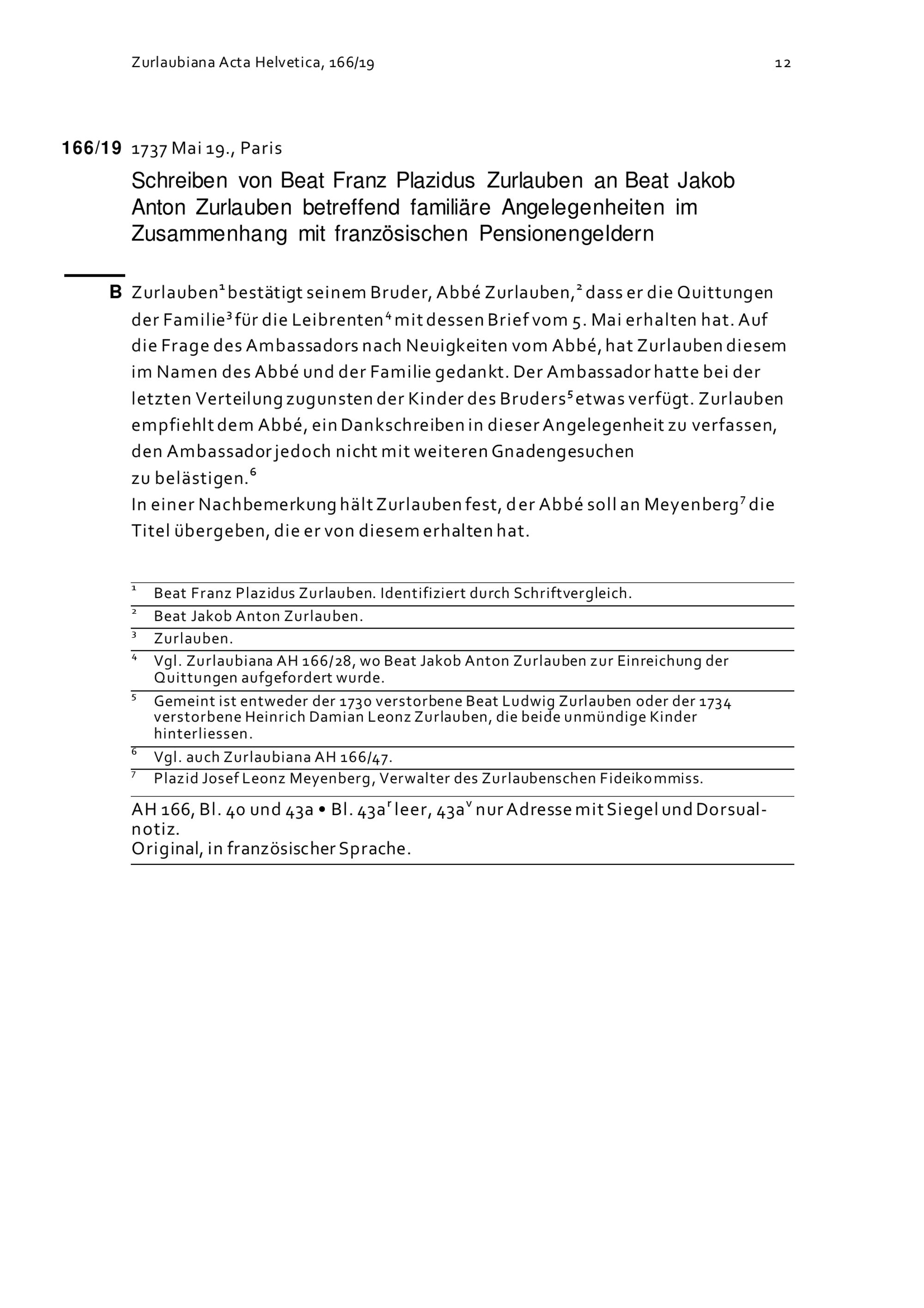 Schreiben von Beat Franz Plazidus Zurlauben an Beat Jakob Anton Zurlauben betreffend...
