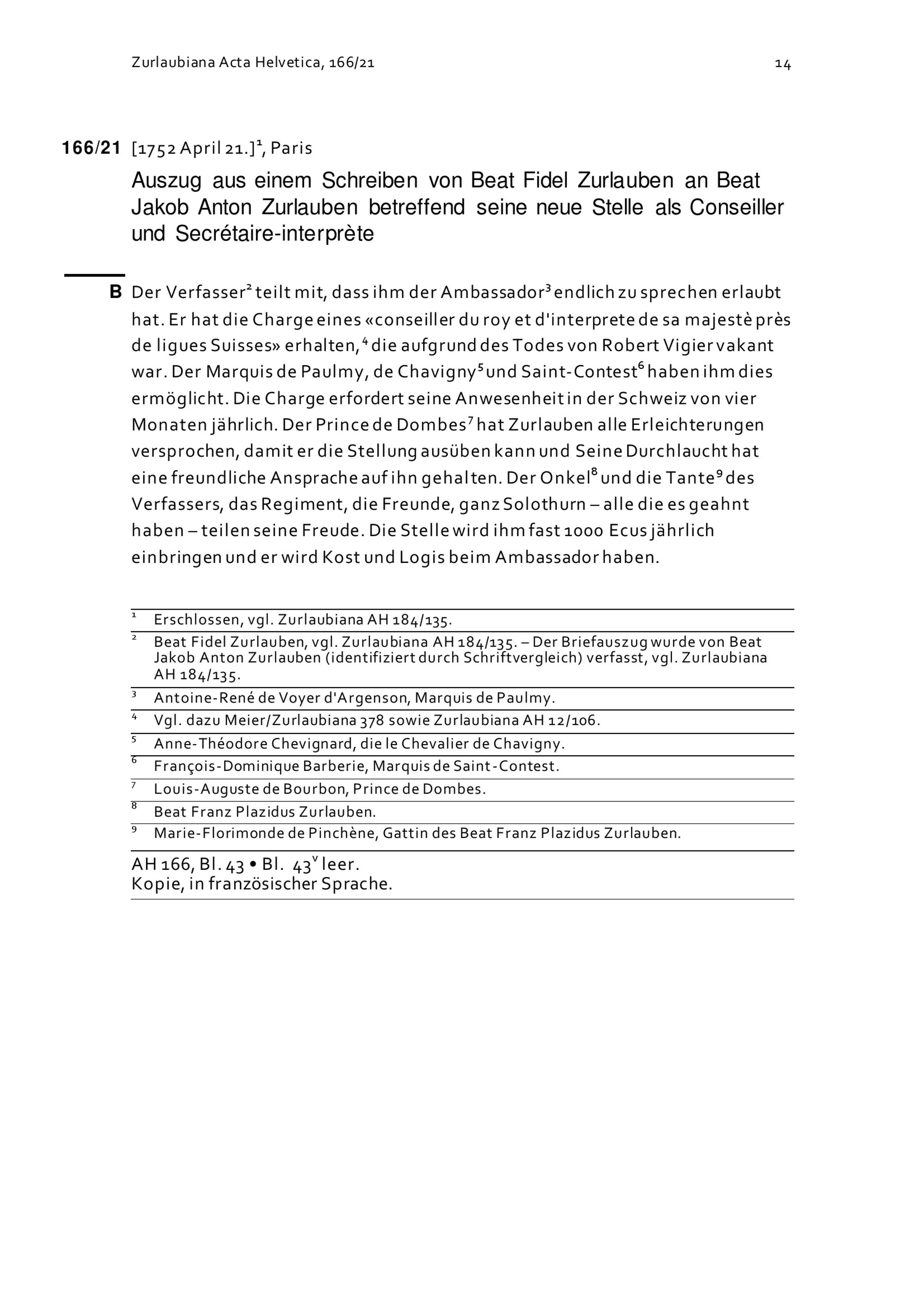 Schreiben von Beat Fidel Zurlauben an Beat Jakob Anton Zurlauben betreffend seine neue Stelle als Conseiller und Secrétaire-interprète
