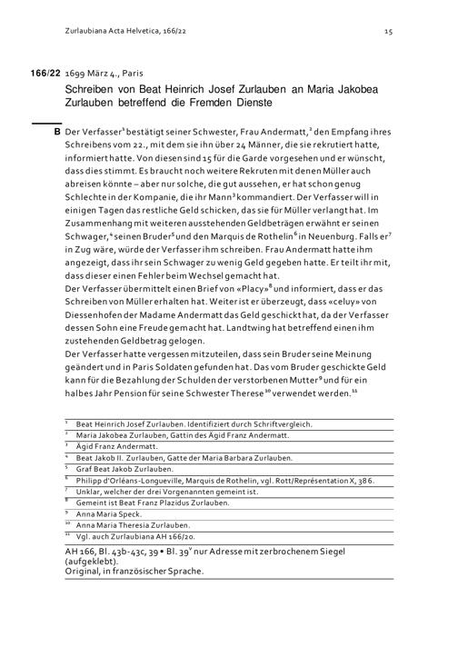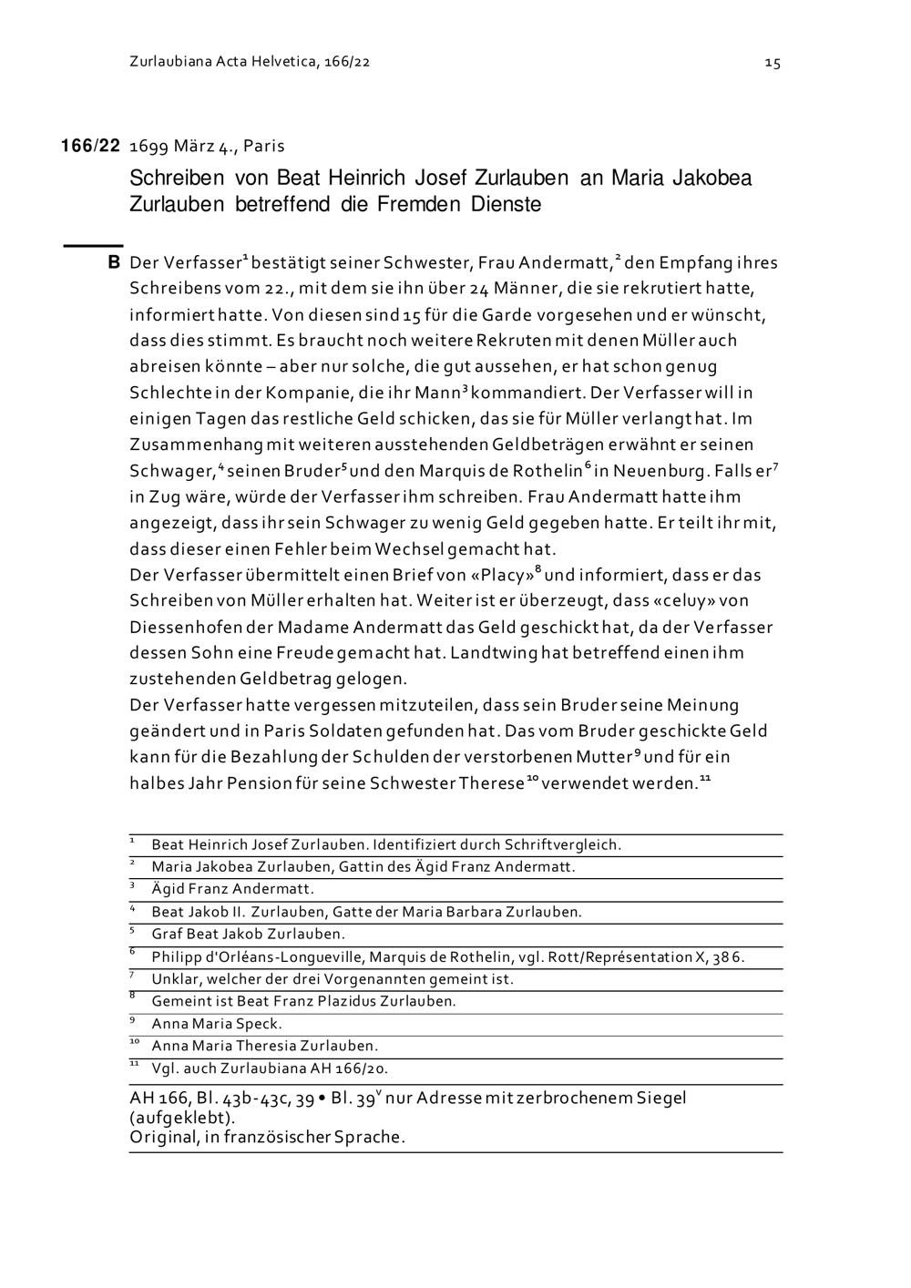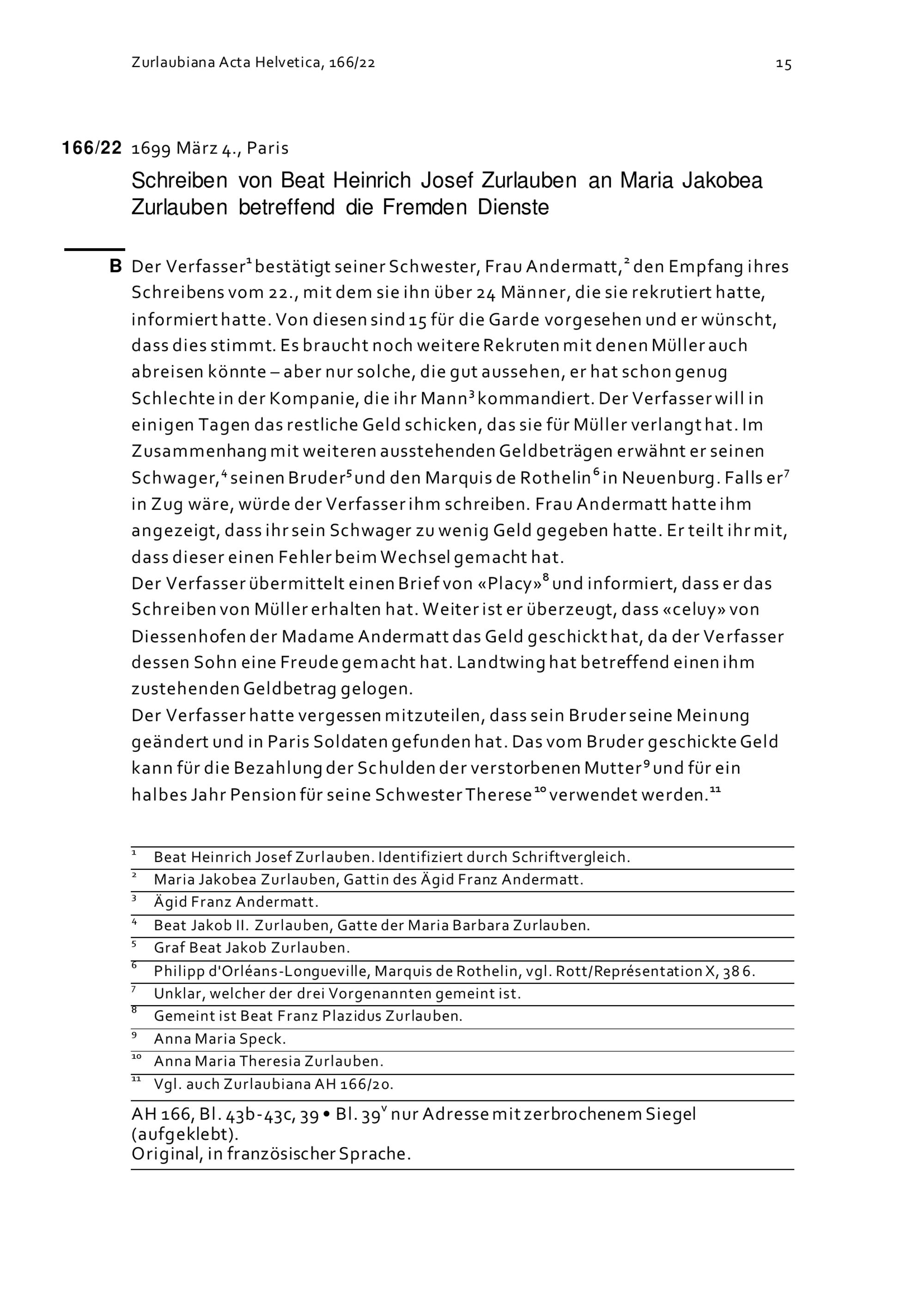Schreiben von Beat Heinrich Josef Zurlauben an Maria Jakobea Zurlauben betreffend die Fremden Dienste