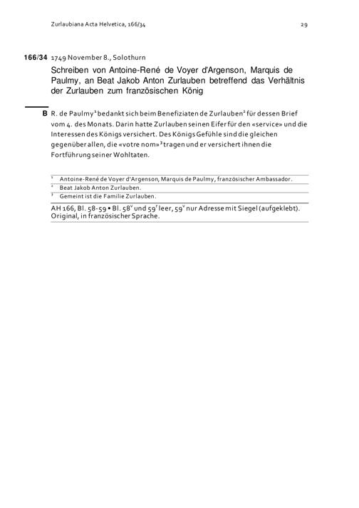 Schreiben von Antoine-René de Voyer d'Argenson, Marquis de Paulmy an Beat Jakob Anton Zurlauben betreffend das Verhältnis der Zurlauben zum König von Frankreich