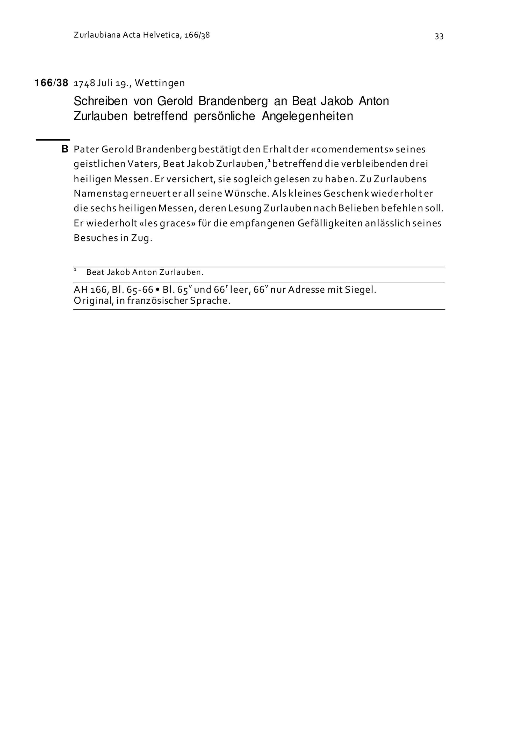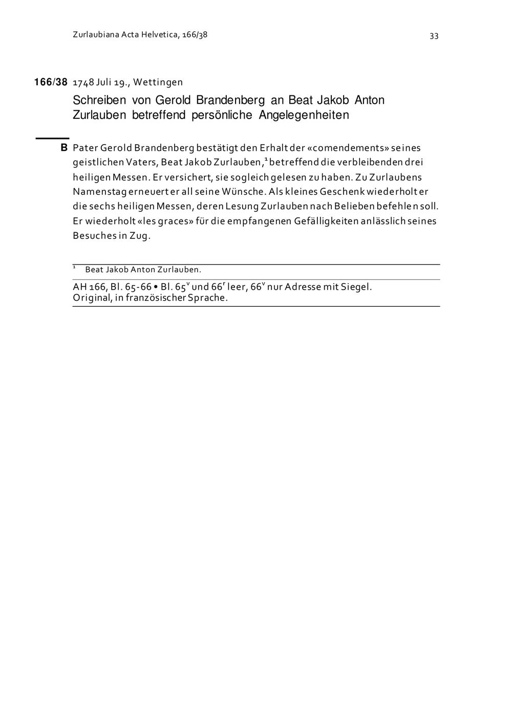 Schreiben von Gerold Brandenberg an Beat Jakob Anton Zurlauben betreffend persönliche...