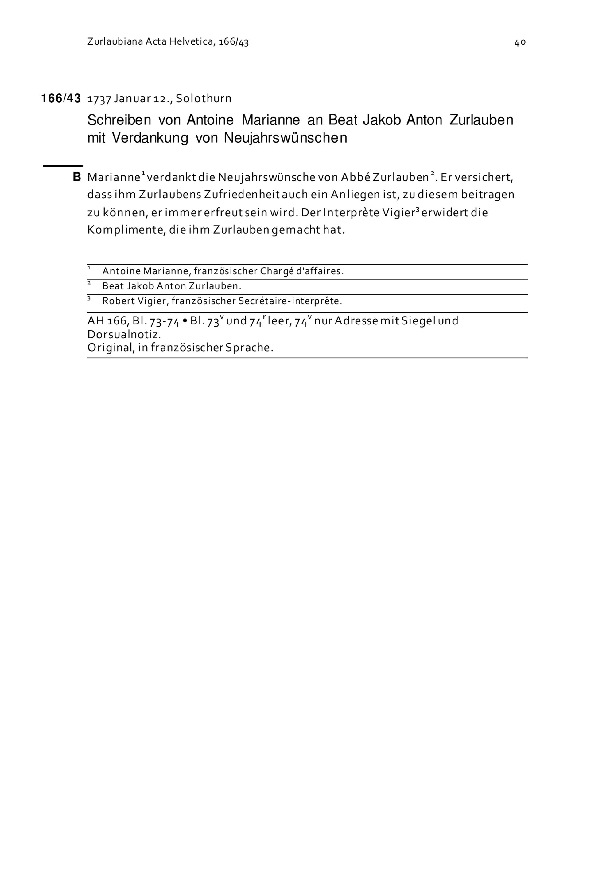 Schreiben von Antoine Marianne an Beat Jakob Anton Zurlauben mit Verdankung von Neujahrswünschen