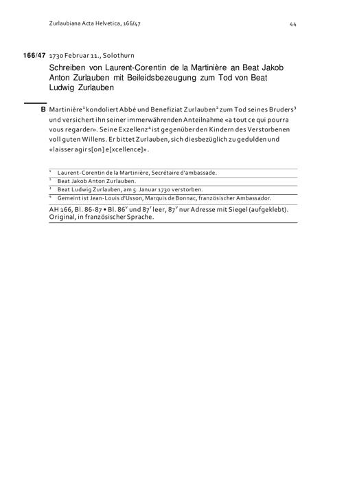 Schreiben von Laurent Corentin de la Martinière an Beat Jakob Anton Zurlauben mit Beileidsbezeugung zum Tod von Beat Ludwig Zurlauben
