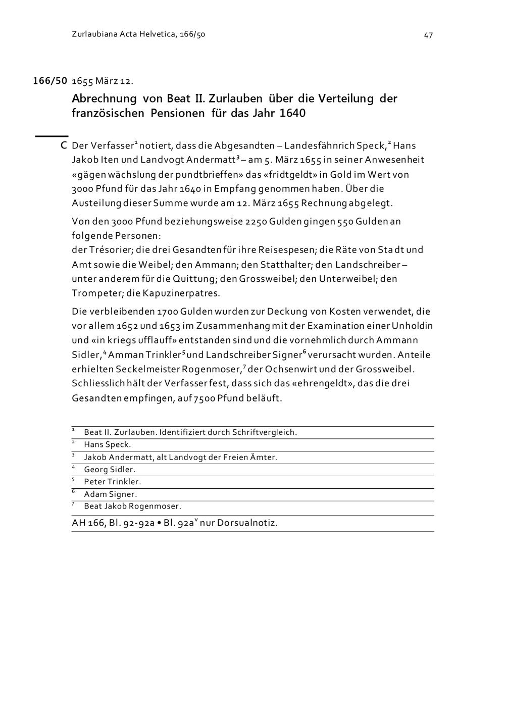 Abrechnung von Beat II. Zurlauben über die Verteilung der französischen Pensionen für das Jahr 1640