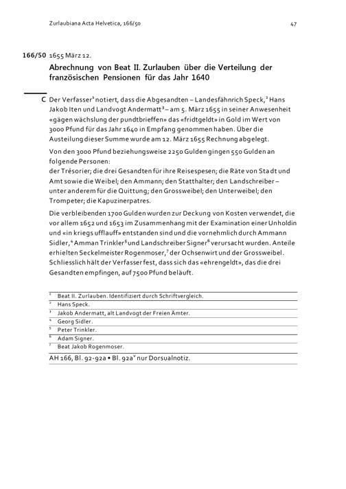 Abrechnung von Beat II. Zurlauben über die Verteilung der französischen Pensionen...
