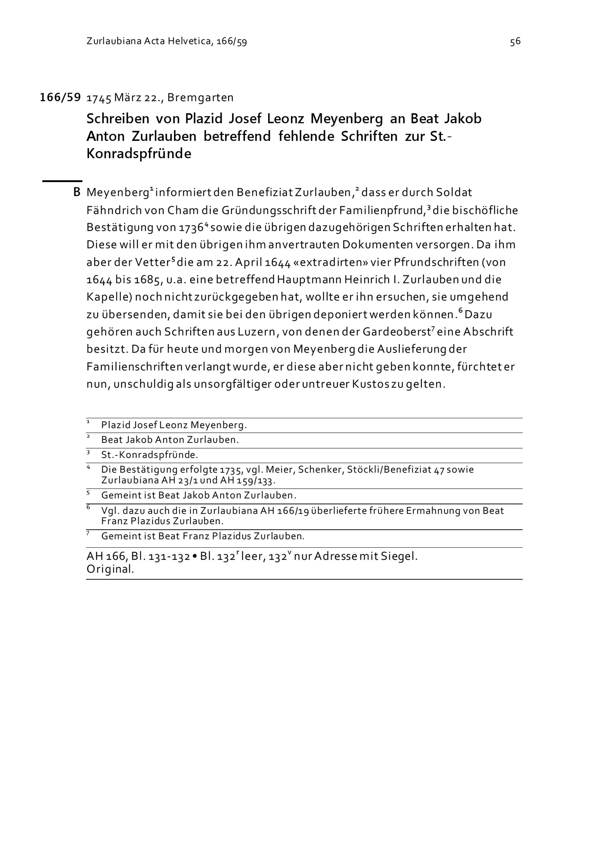Schreiben von Plazid Josef Leonz Meyenberg an Beat Jakob Anton Zurlauben betreffend fehlende Schriften zur Sankt-Konradspfrund