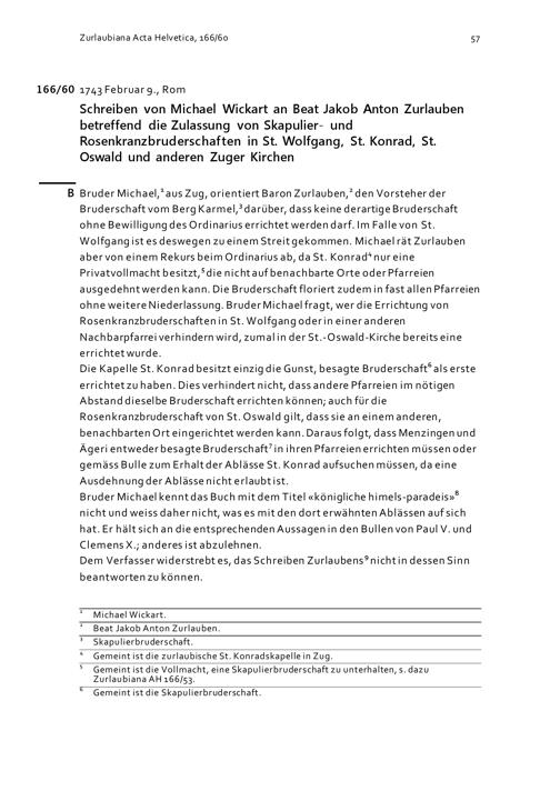 Schreiben von Michael Wickart an Beat Jakob Anton Zurlauben betreffend die Zulassung von Skapulier- und Rosenkranzbruderschaften in Sankt-Wolfgang, Sankt-Konrad, Sankt-Oswald und anderen Zuger Kirchen
