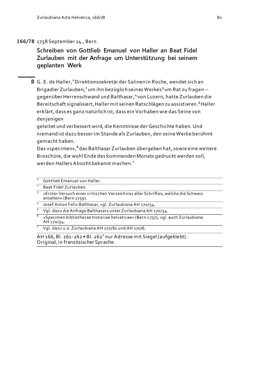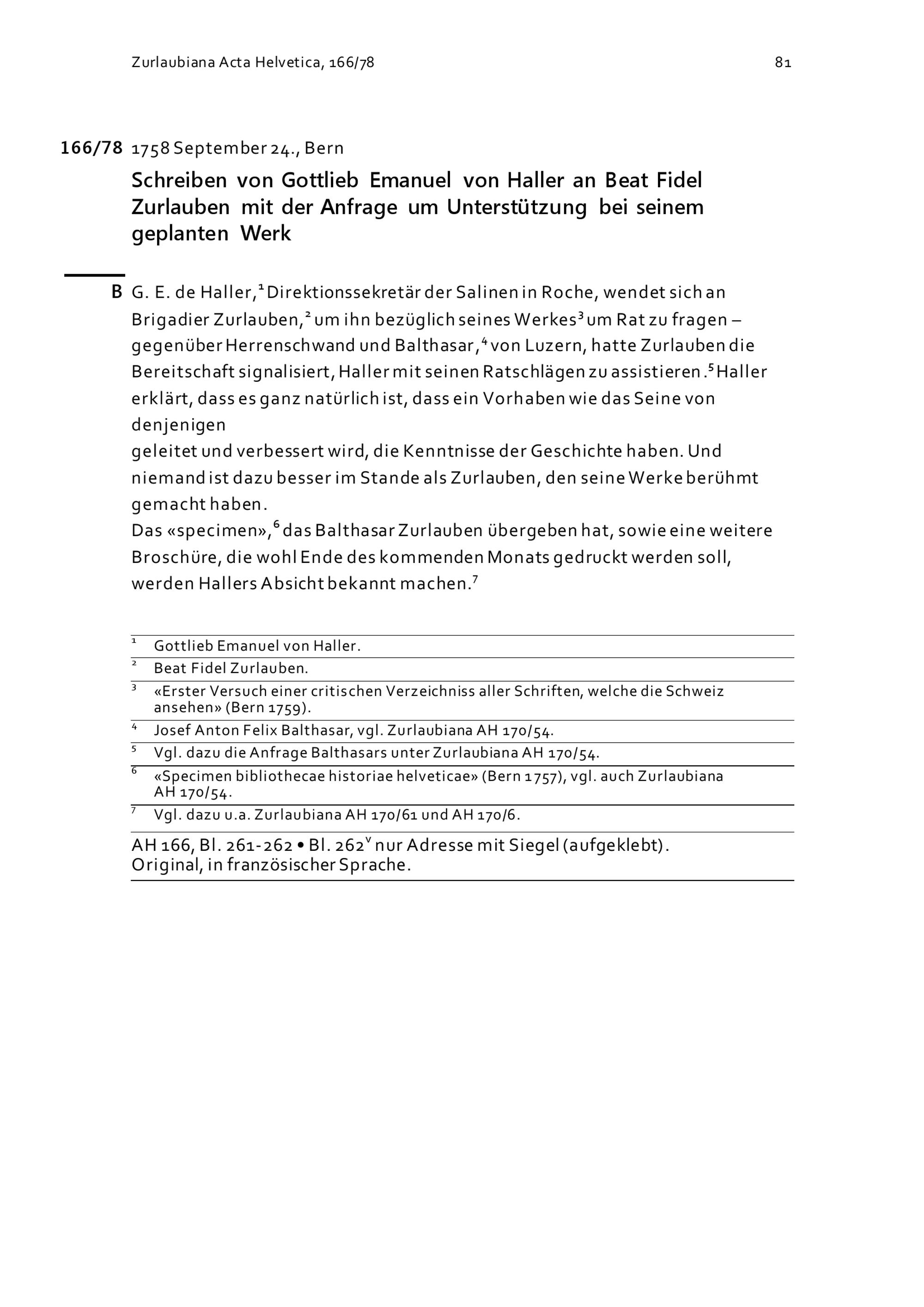 Schreiben von Gottlieb Emanuel von Haller an Beat Fidel Zurlauben mit der Anfrage um Unterstützung bei seinem geplanten Werk
